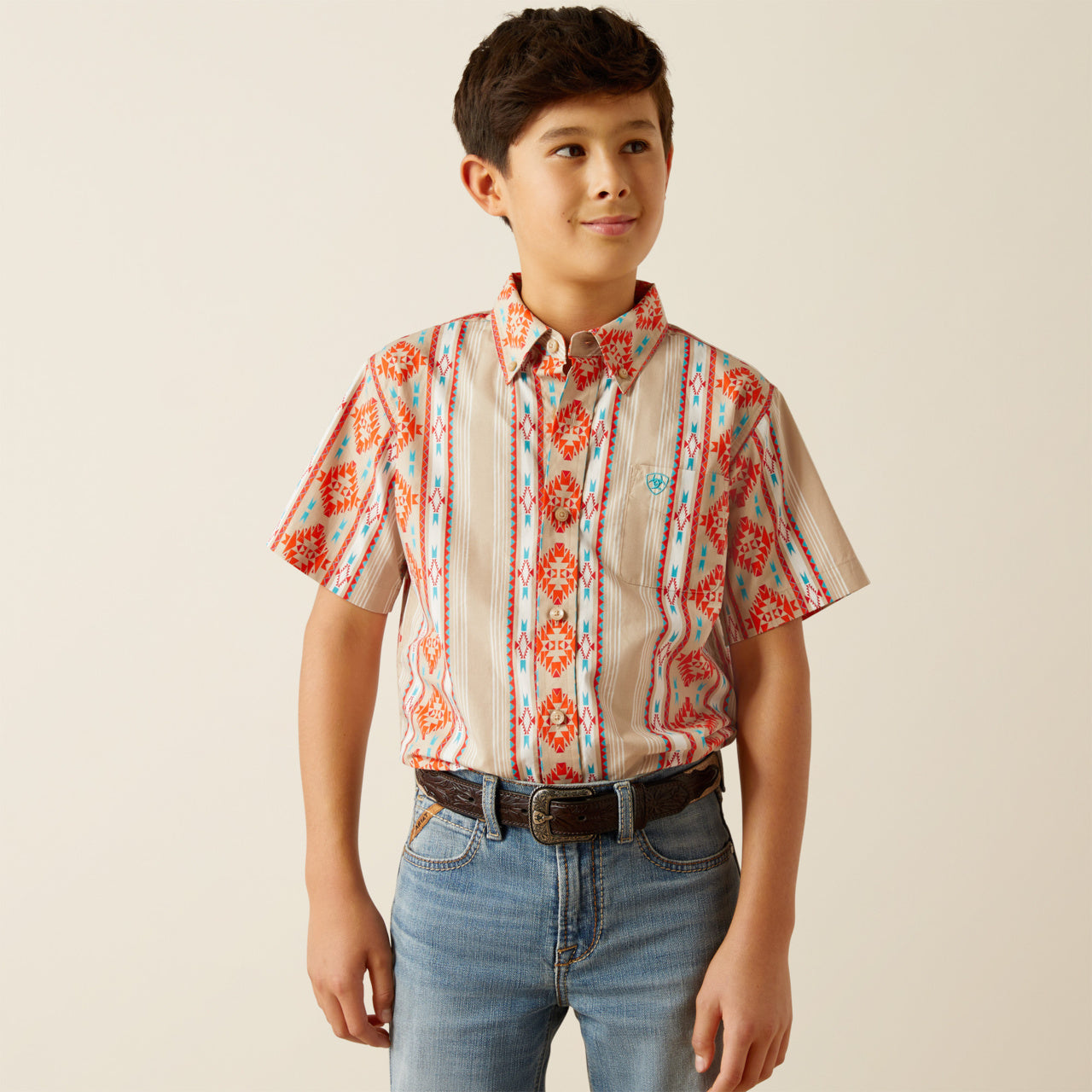 Unleash their wild style with the BR Ariat Boys Wade Classic SS Shirt. Easily roll up the cuffs with extended button detail for a more relaxed look. The button-front closure and buttoned collar points add a classic touch, while the extra-long hem keeps them comfortable and covered in motion. Ariat® branding details complete this 100% cotton, generously-fitting shirt.