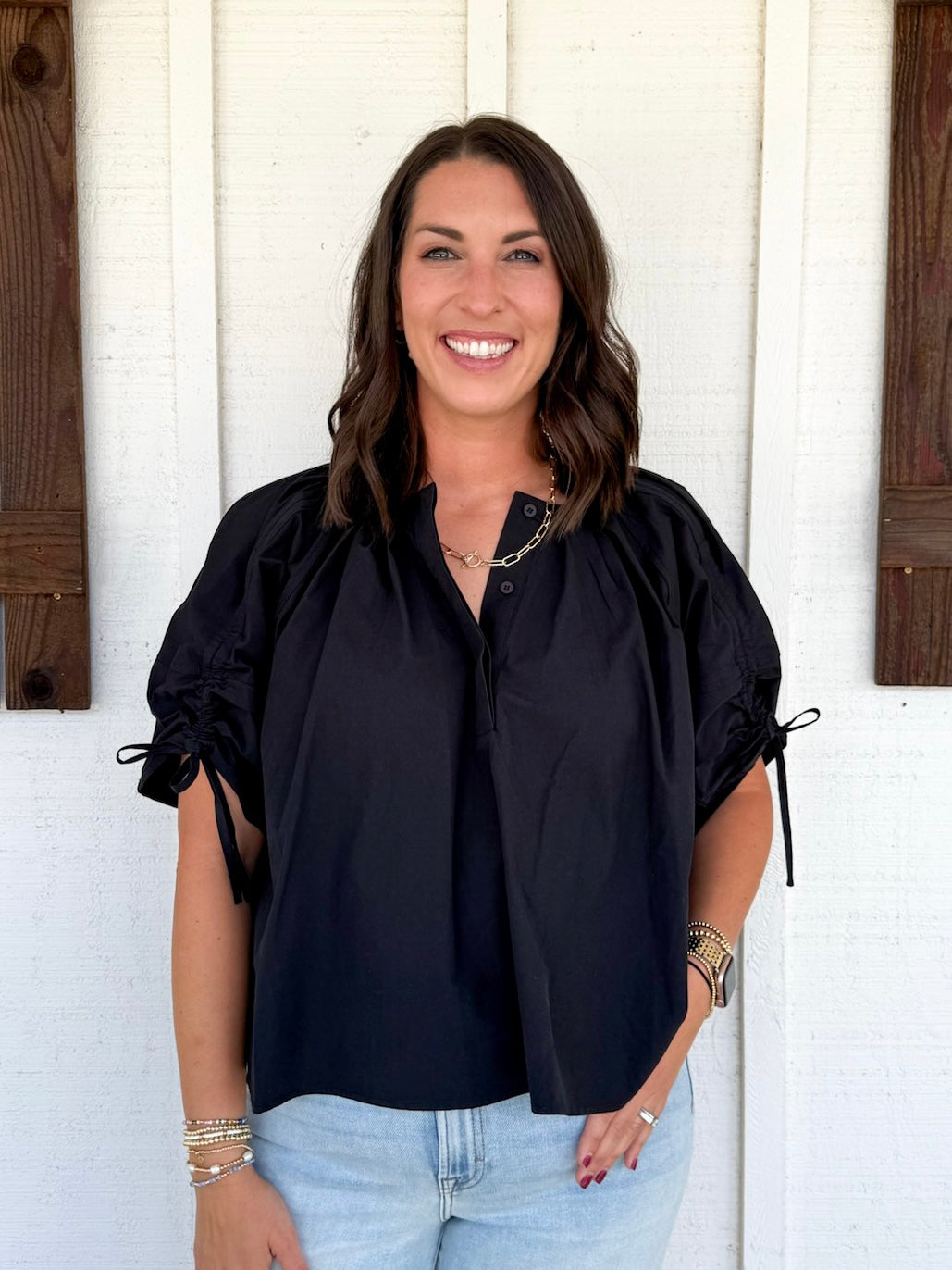 The Portian Top brings a fresh twist to your wardrobe with its adjustable tie detail sleeves that let you customize your look. Crafted from soft pleated cotton, it offers both comfort and style. Perfect for playful days out or relaxed evenings, this top adds effortless charm to any outfit with its unique sleeve design and breathable fabric.