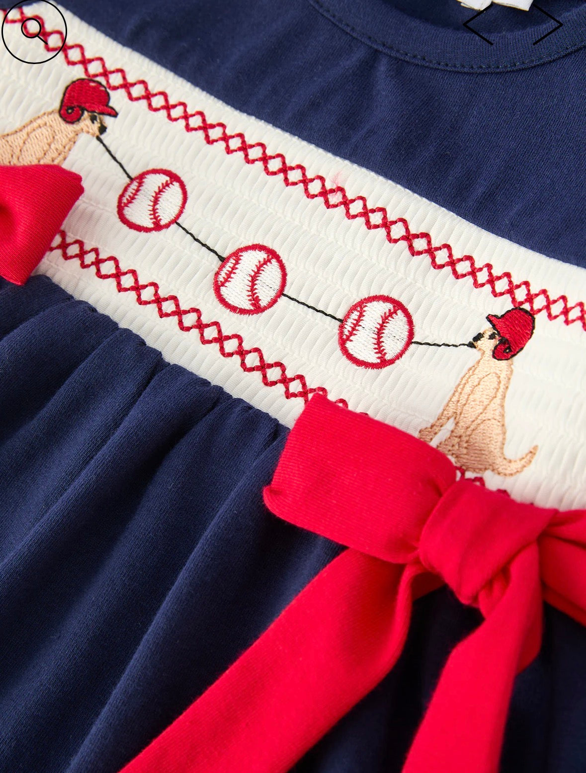Dress your little one in adorable comfort with this Girls Bloomers Romper Set featuring charming dog and baseball smocking embroidery. Soft, breathable fabric ensures all-day ease, while the playful design adds a touch of whimsy to any occasion. Perfect for warm days or layering, this romper set combines style and practicality for your child’s wardrobe.