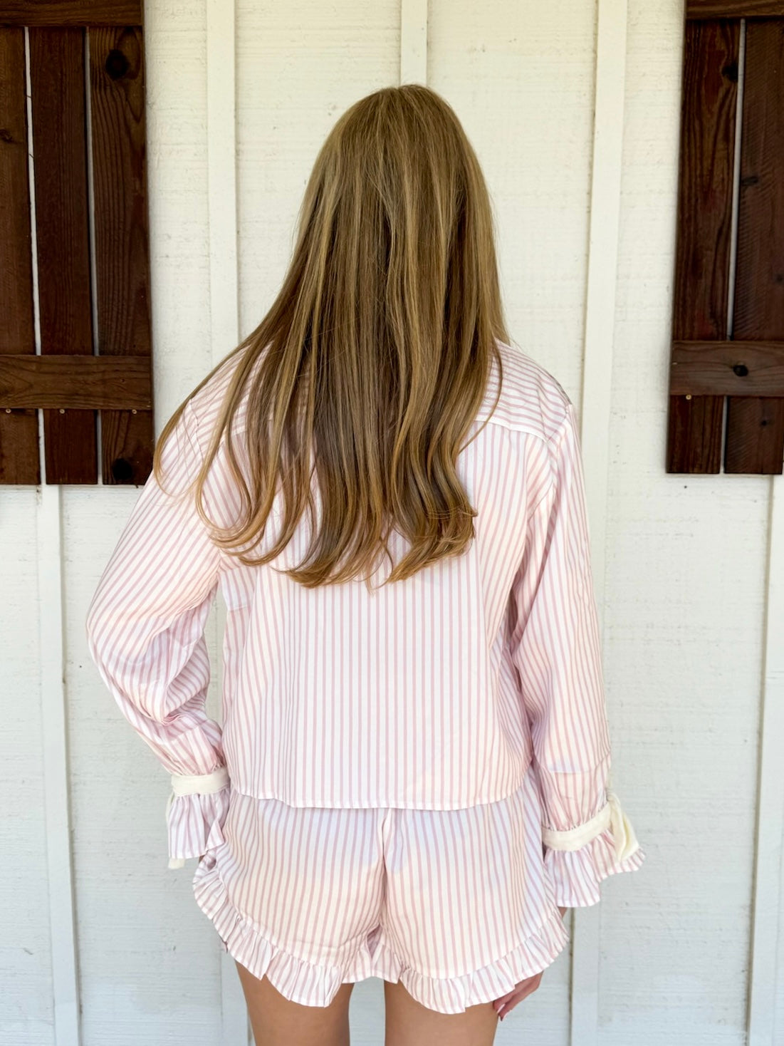 Experience cozy charm with The Clinton Pajama Set, featuring velvet binding that adds a touch of luxe softness. The detailed stripes bring a classic vibe, while the dainty mini embroidery offers a whimsical twist. Perfect for lounging in style and comfort with a playful touch.