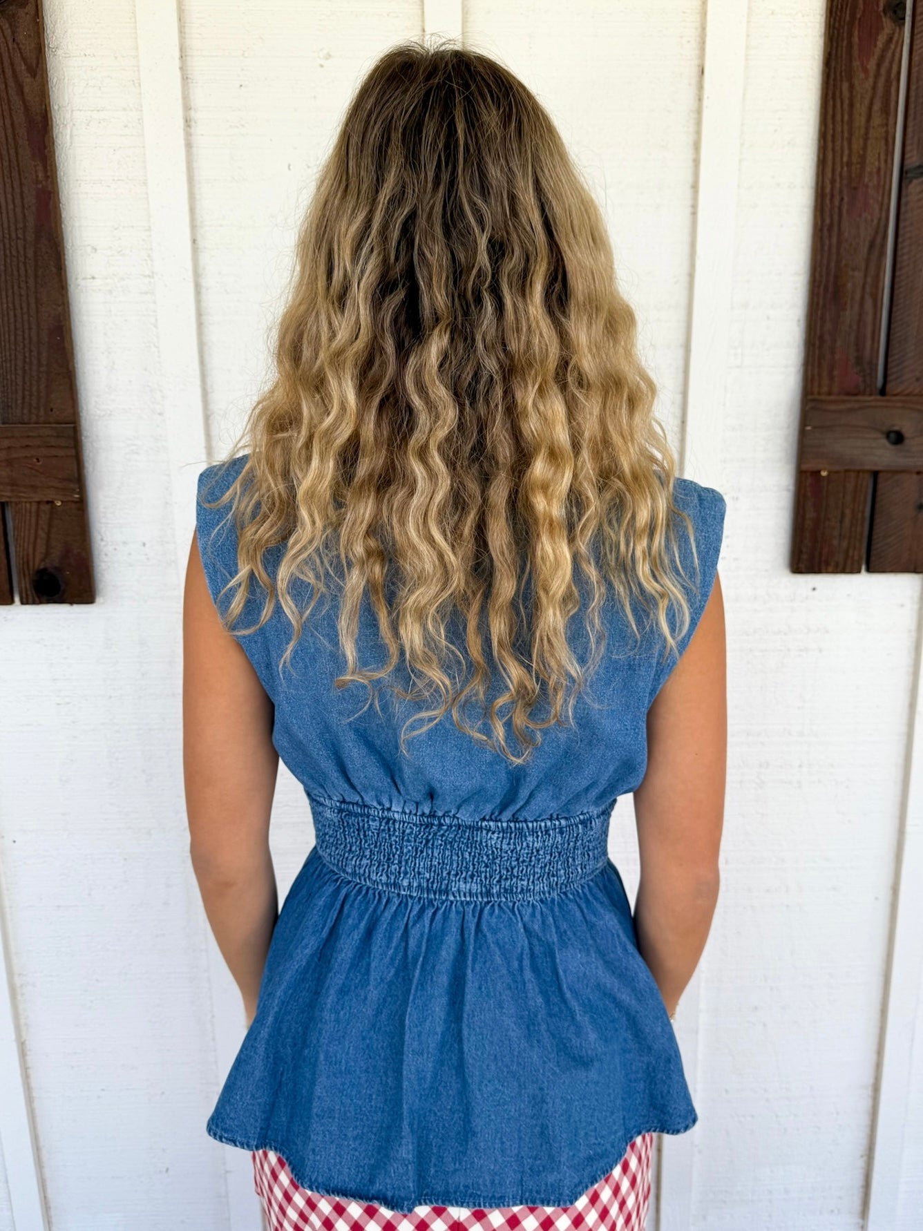The Haylo Top is your new playful favorite! This solid sleeveless denim peplum style flares at the waist, thanks to a wide smocked band that hugs just right. Lightweight and woven, it’s easy to wear all day without feeling heavy, while the front zipper adds a fun twist to this non-sheer, unlined design. Perfect for adding a flirty touch to your casual looks!