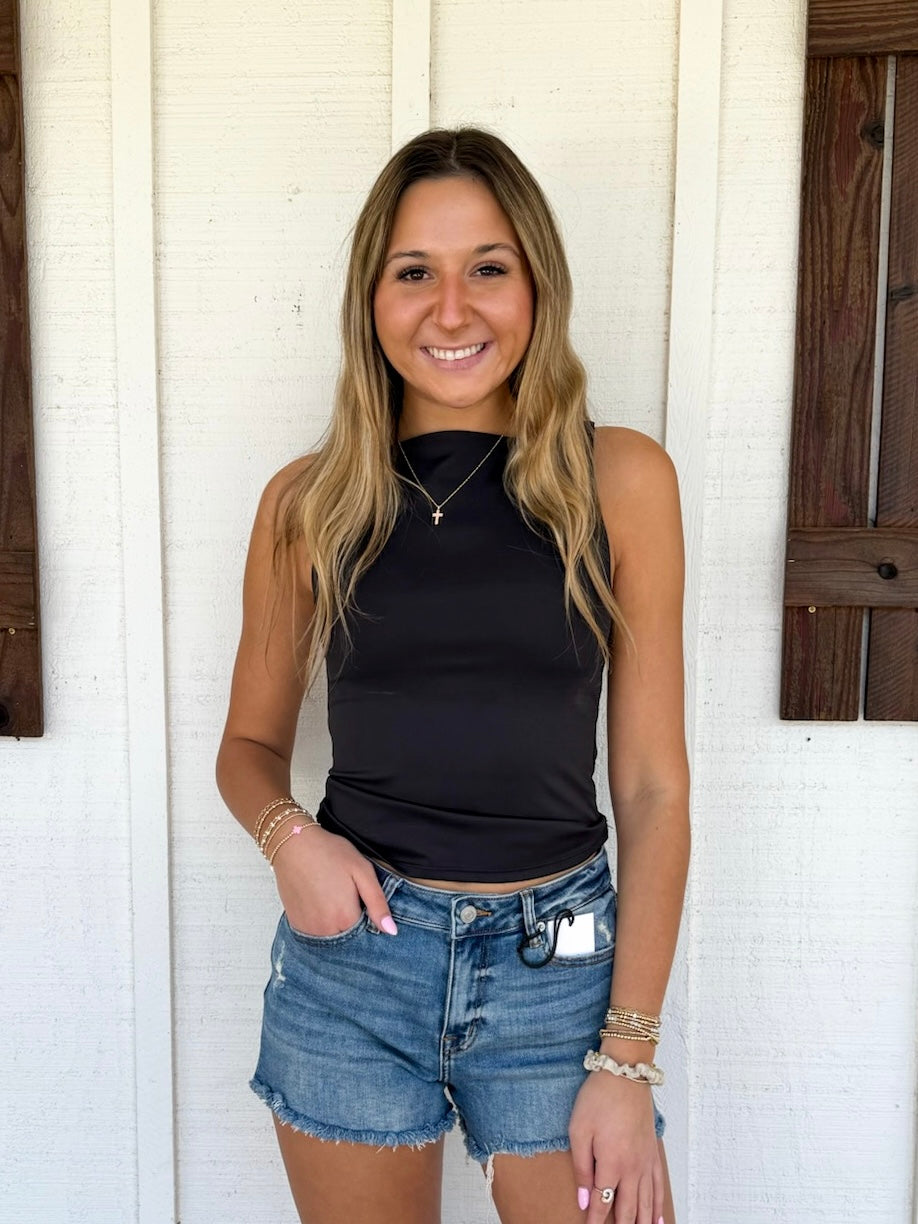 Gracie in Black is wearing a size Small. Height is 5’11”, Bust is 32, Waist is 25”-26”