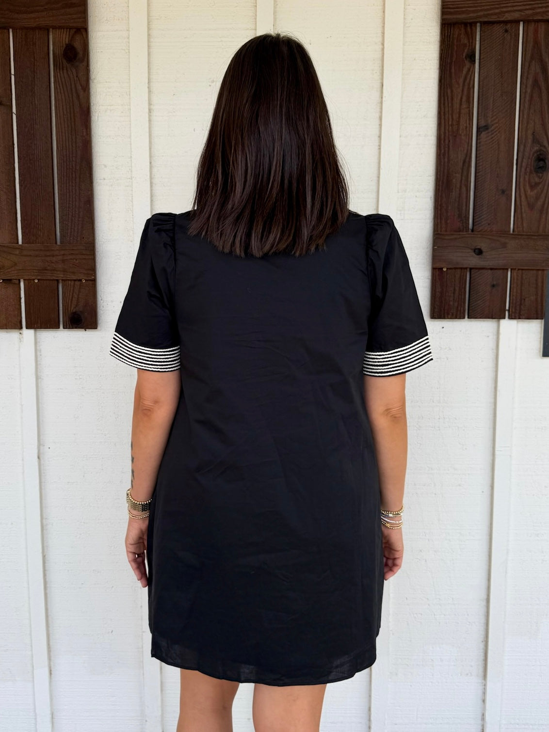 The Mazzy Dress is your go-to for effortless charm with its short puff sleeves and flirty mini length. Lightweight and lined for comfort, it features a delicate embroidered trim along the V-neck and eye-catching front applique. Convenient side pockets add a touch of practicality without sacrificing style. Made from a woven, non-sheer fabric, this dress keeps things fresh and playful wherever you wear it.