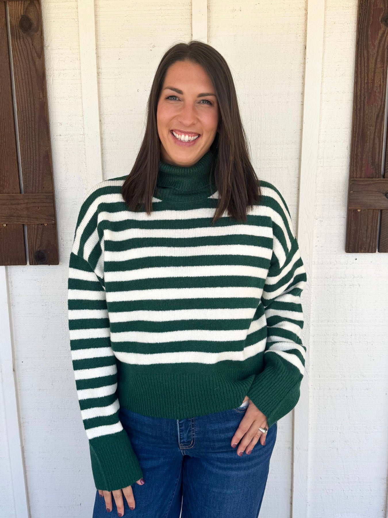 This striped sweater blends timeless appeal with contemporary flair, featuring a warm turtleneck and bold horizontal stripes. Crafted to enhance comfort, its relaxed fit makes it ideal for casual outings. For a stylish ensemble, pair with fitted jeans and ankle boots, perfect for a crisp fall day. Accessorize with a simple watch or a cozy scarf to elevate the look.