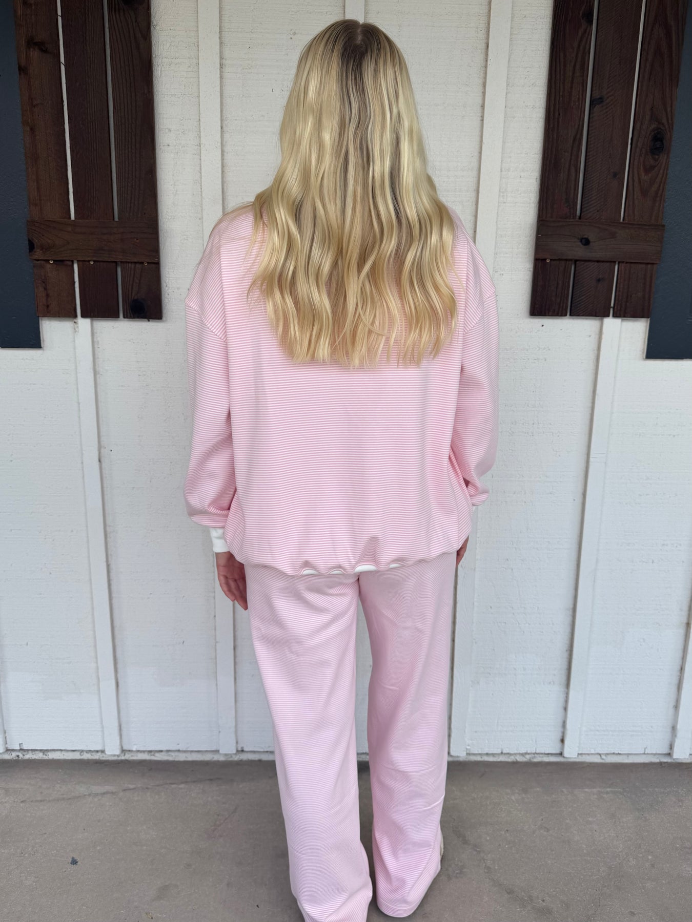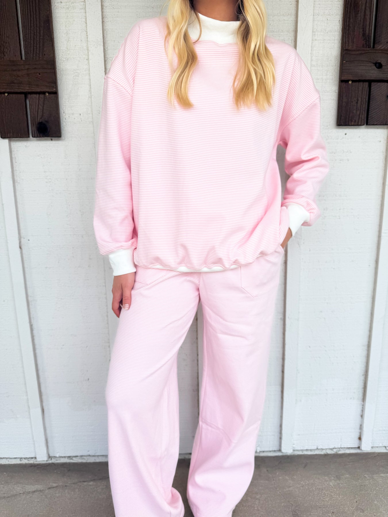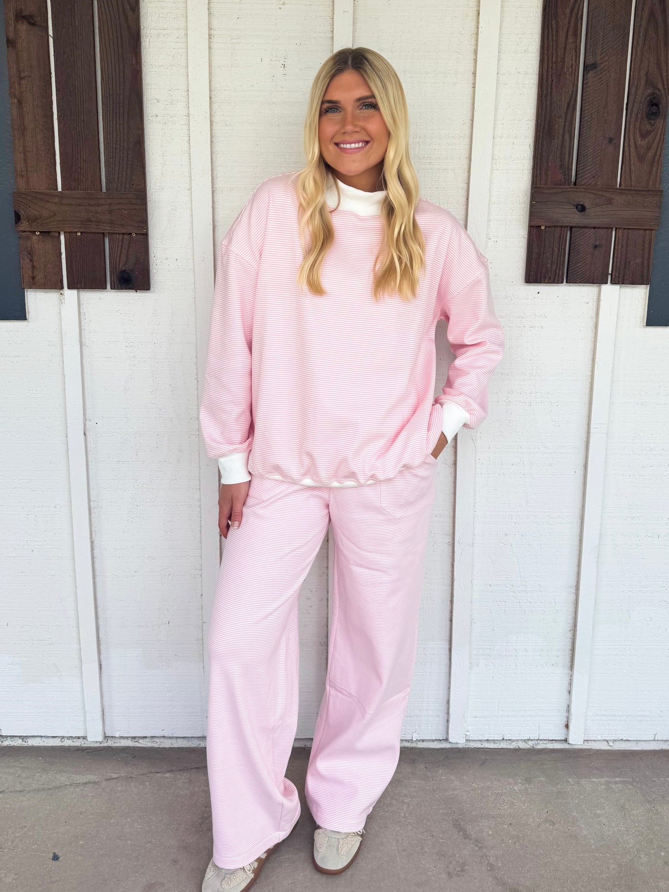The Corby Set pairs striped pants with a matching striped long sleeve top, creating a comfy and casual look perfect for fall. This trendy duo blends style with coziness, making it your go-to outfit for crisp days and relaxed vibes. Embrace fall fashion with effortless flair and a playful edge in this standout set.