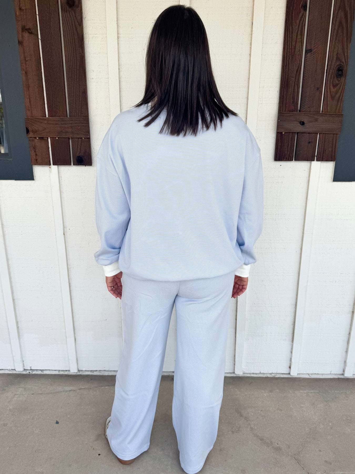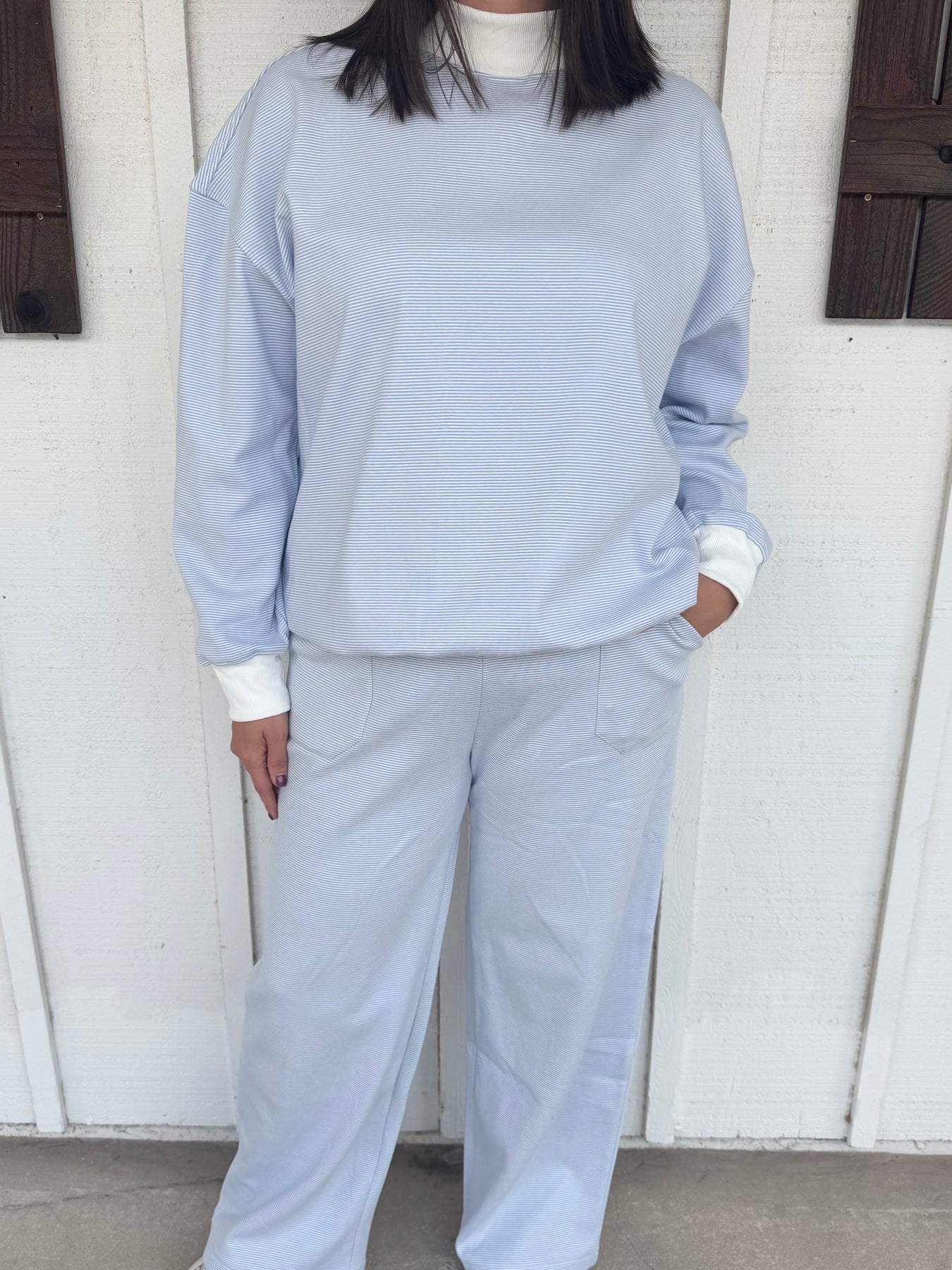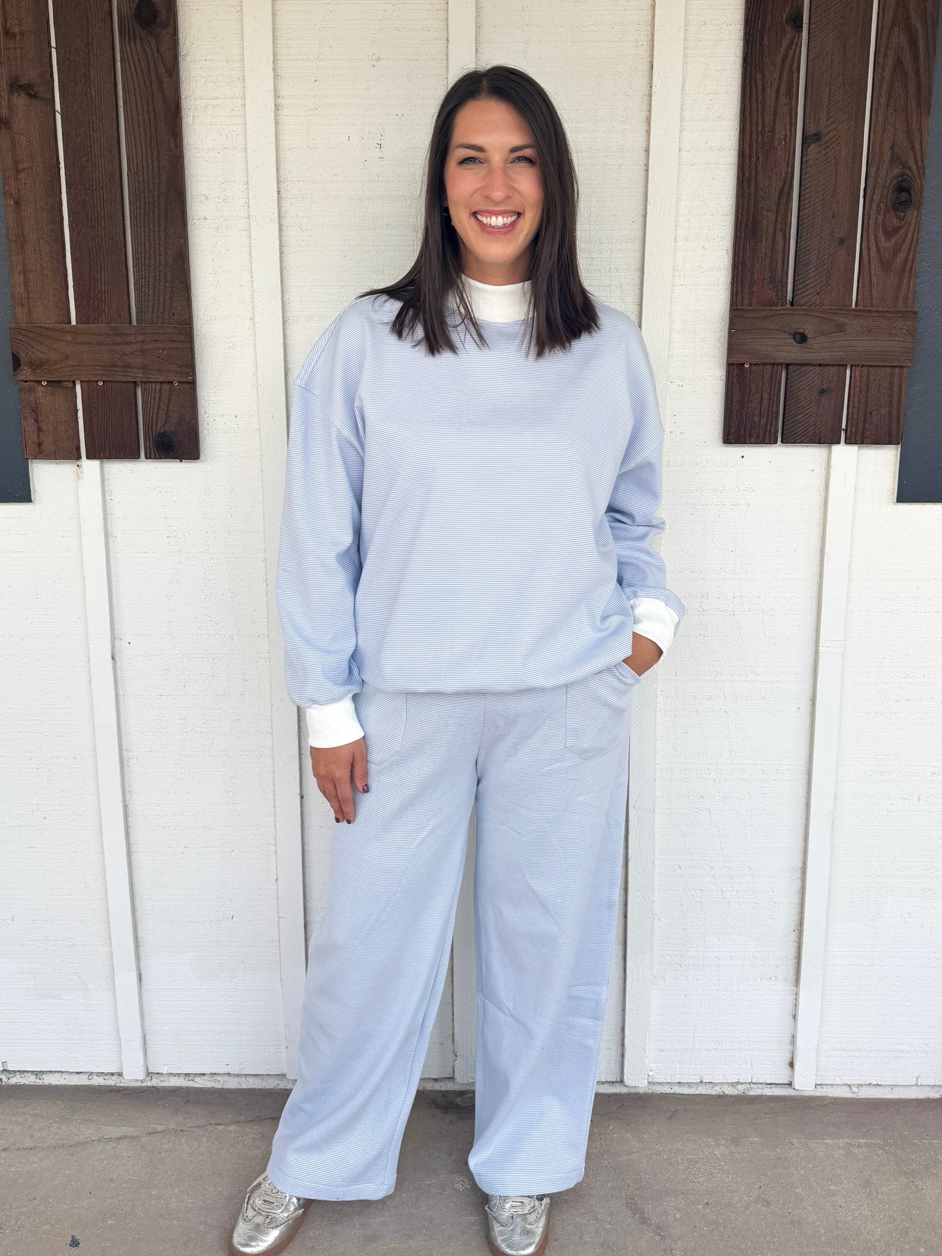 The Corby Set pairs striped pants with a matching striped long sleeve top, creating a comfy and casual look perfect for fall. This trendy duo blends style with coziness, making it your go-to outfit for crisp days and relaxed vibes. Embrace fall fashion with effortless flair and a playful edge in this standout set.