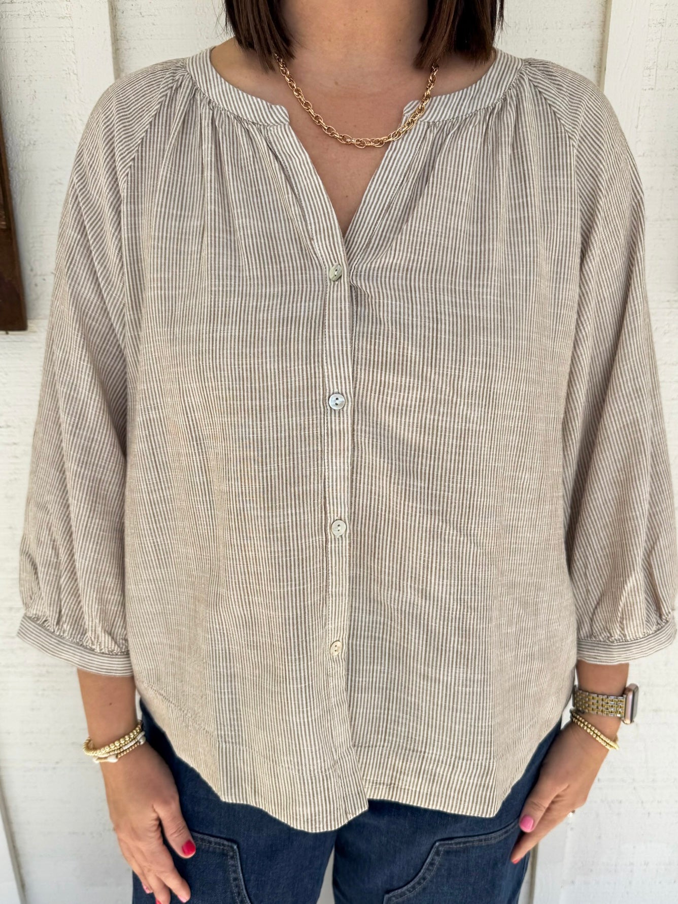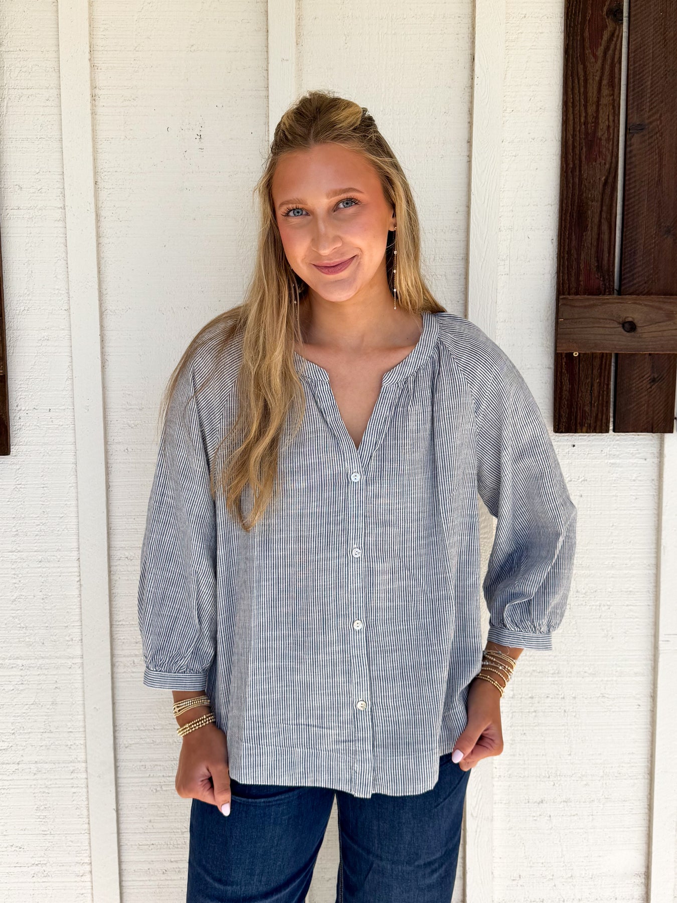 The Hope Top brings effortless charm to your everyday rotation. This mandarine collar button-down features playful 3/4 balloon sleeves that add movement and personality, while delicate shirring at the neckline creates a flattering Y-neck silhouette. The relaxed fit and crisp pinstripe pattern make it endlessly versatile—dress it up with tailored trousers or keep it casual with your favorite jeans. A wardrobe essential that works as hard as you do, with style to spare.