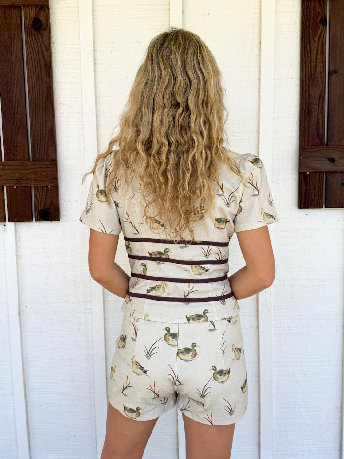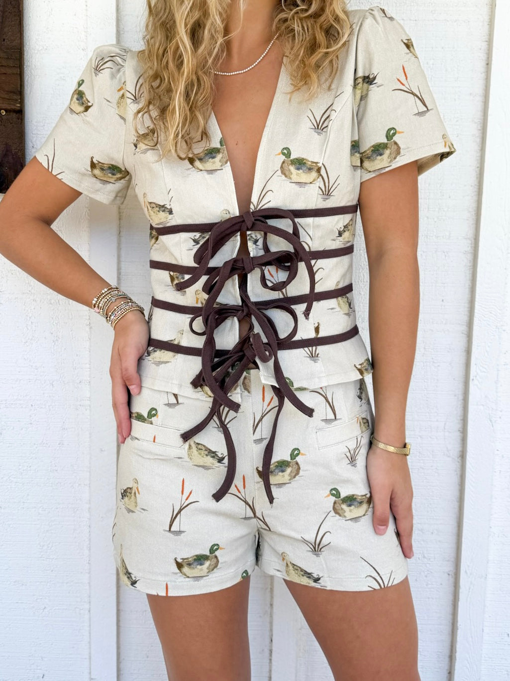 Get ready to waddle into fun with The Ducky Set! This playful two-piece features a charming duck graphic corset top paired with matching shorts that bring whimsical style to your wardrobe. Perfect for anyone who loves quirky, coordinated looks with personality. Whether you're heading out for a casual day or want to make a statement, this set delivers comfort and charm in one adorable package.