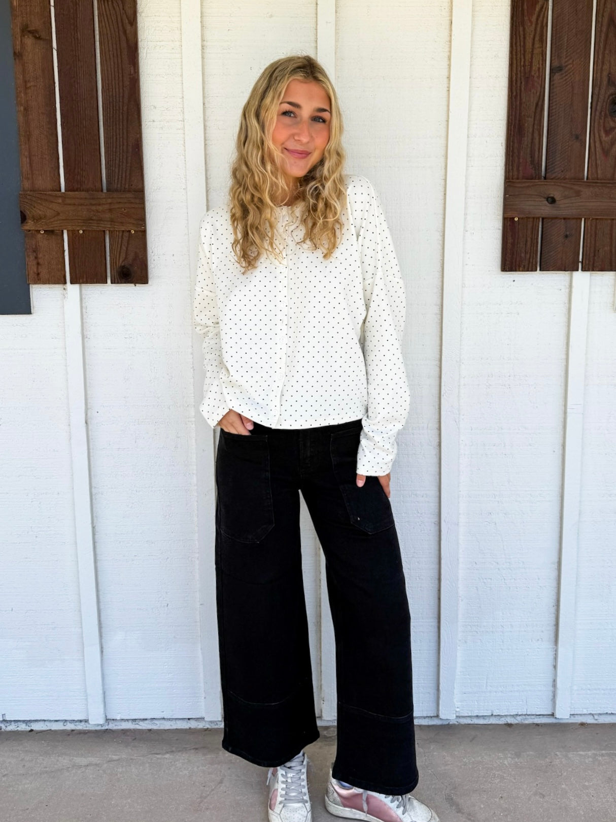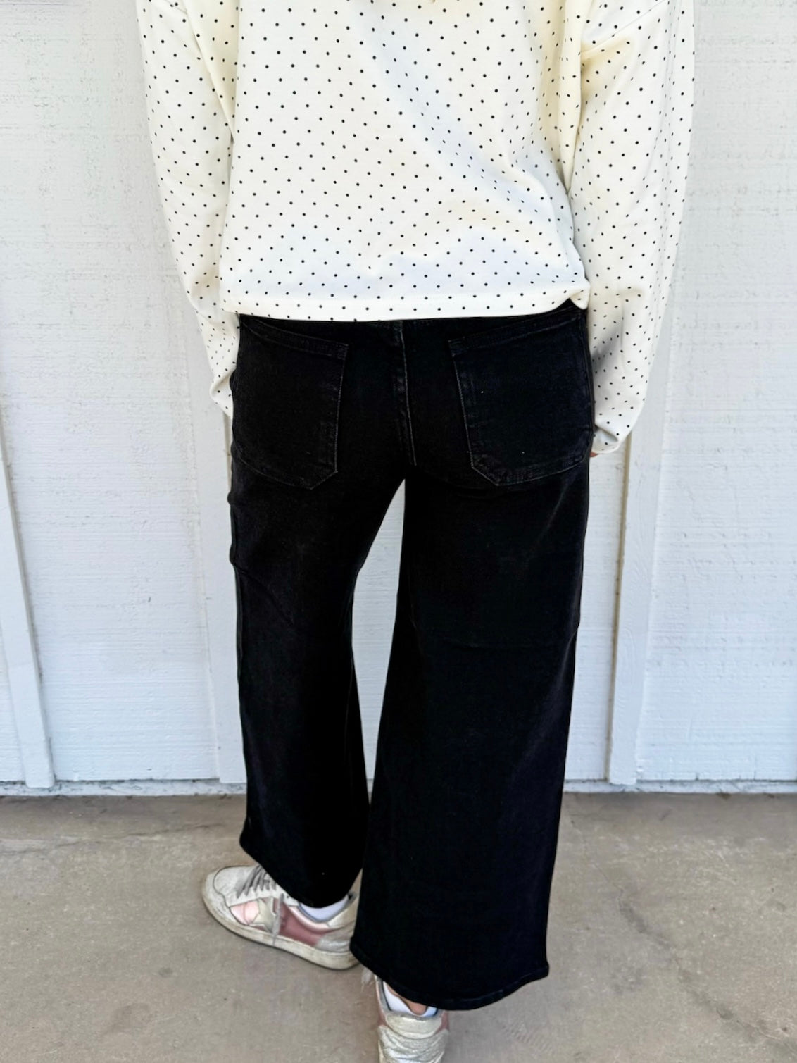 With a flattering high-rise waist and a relaxed, wide-leg cut, these pants create an effortlessly chic silhouette that's both comfortable and stylish. The cropped length adds a modern edge, perfect for showcasing your favorite shoes, while the deep black wash ensures versatility for any occasion.