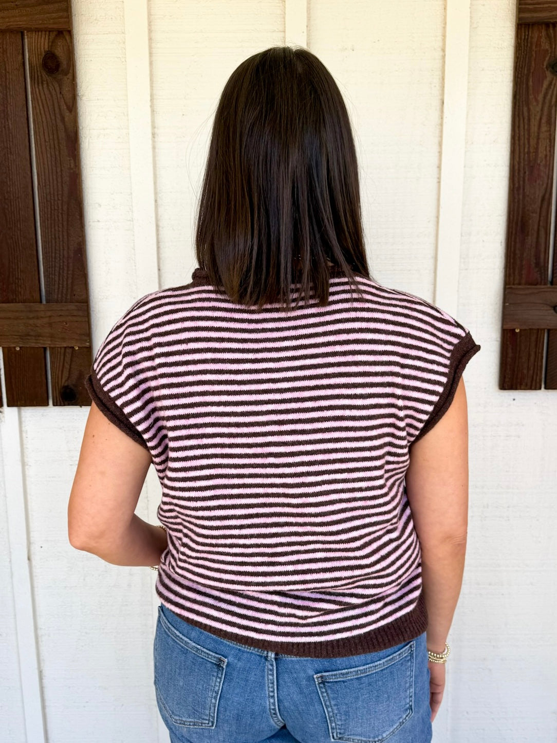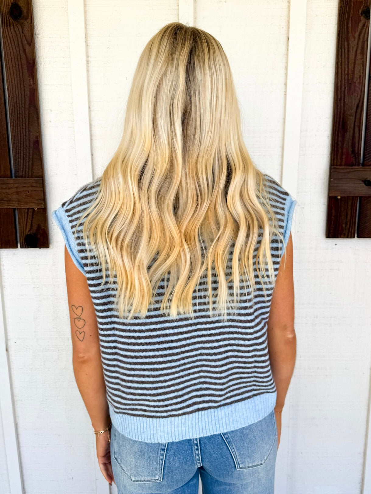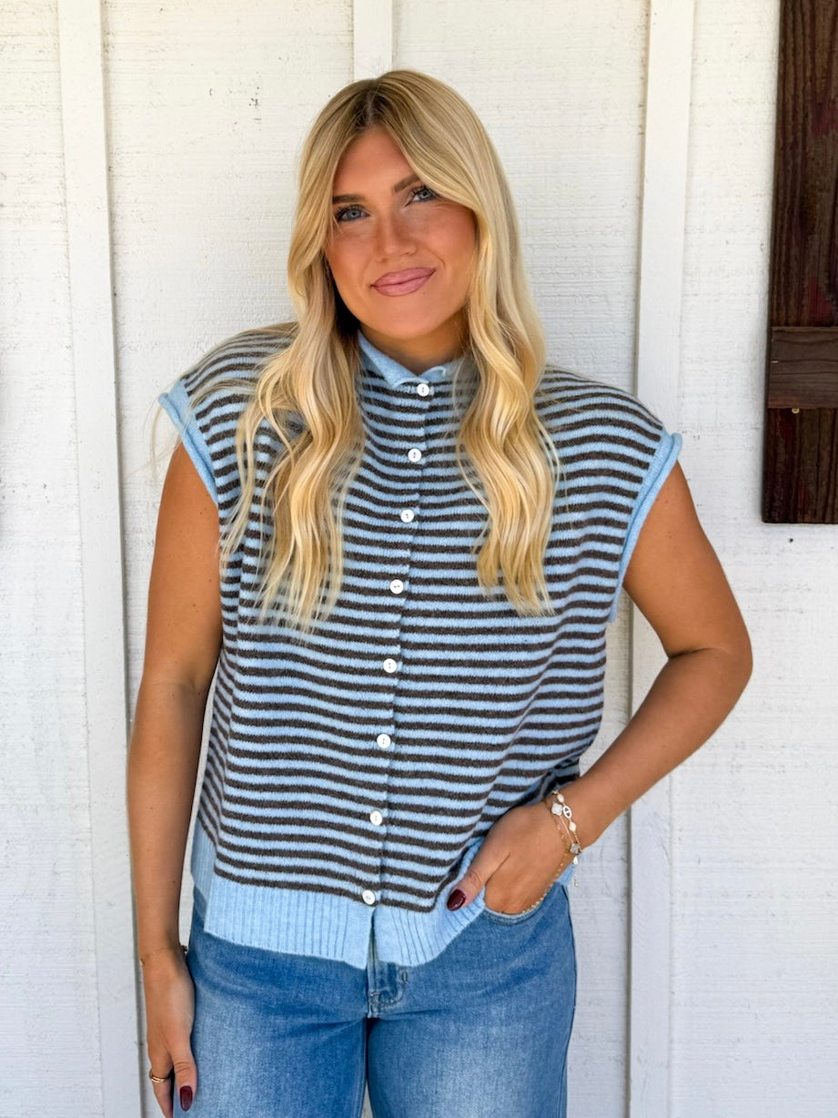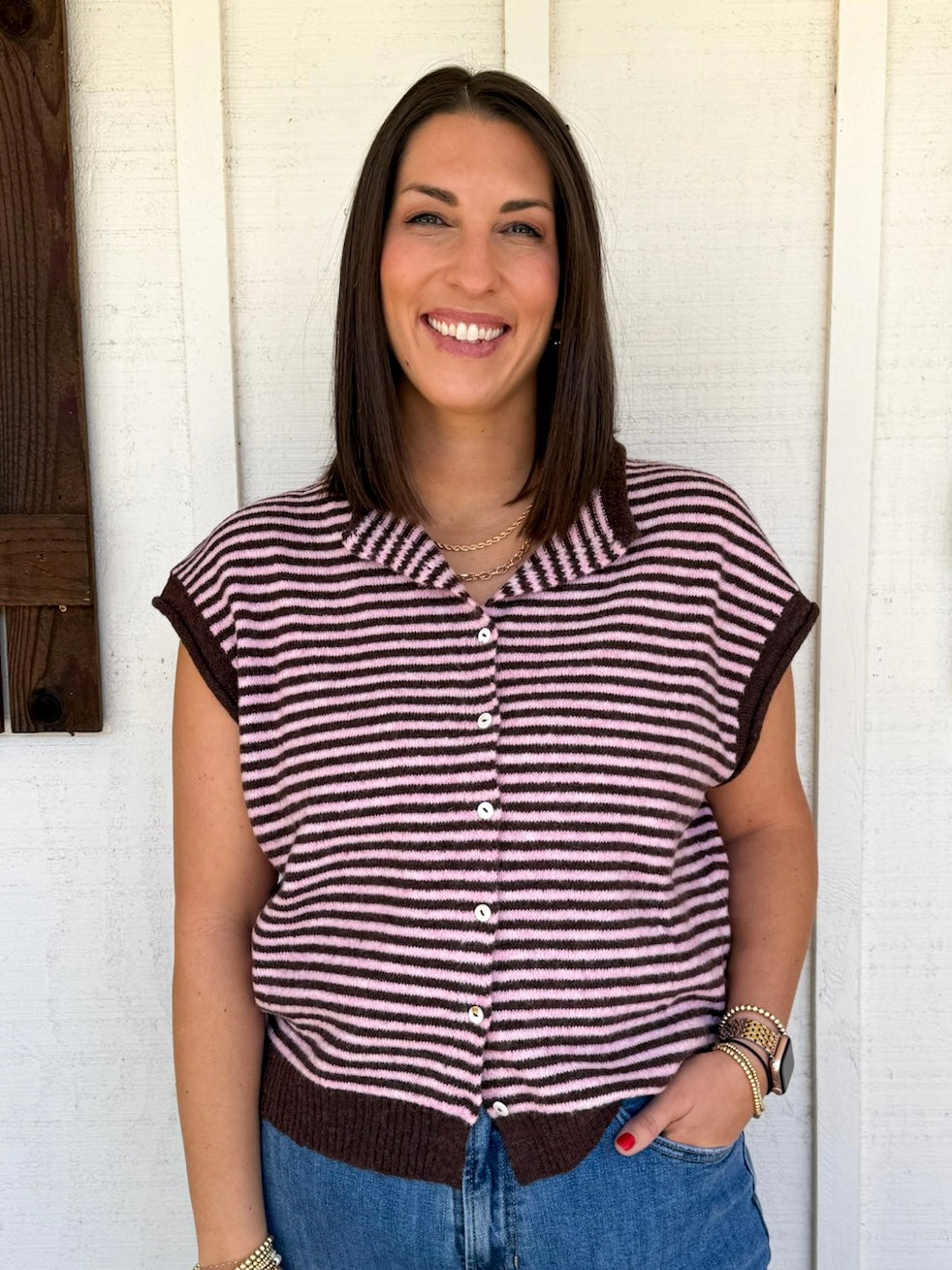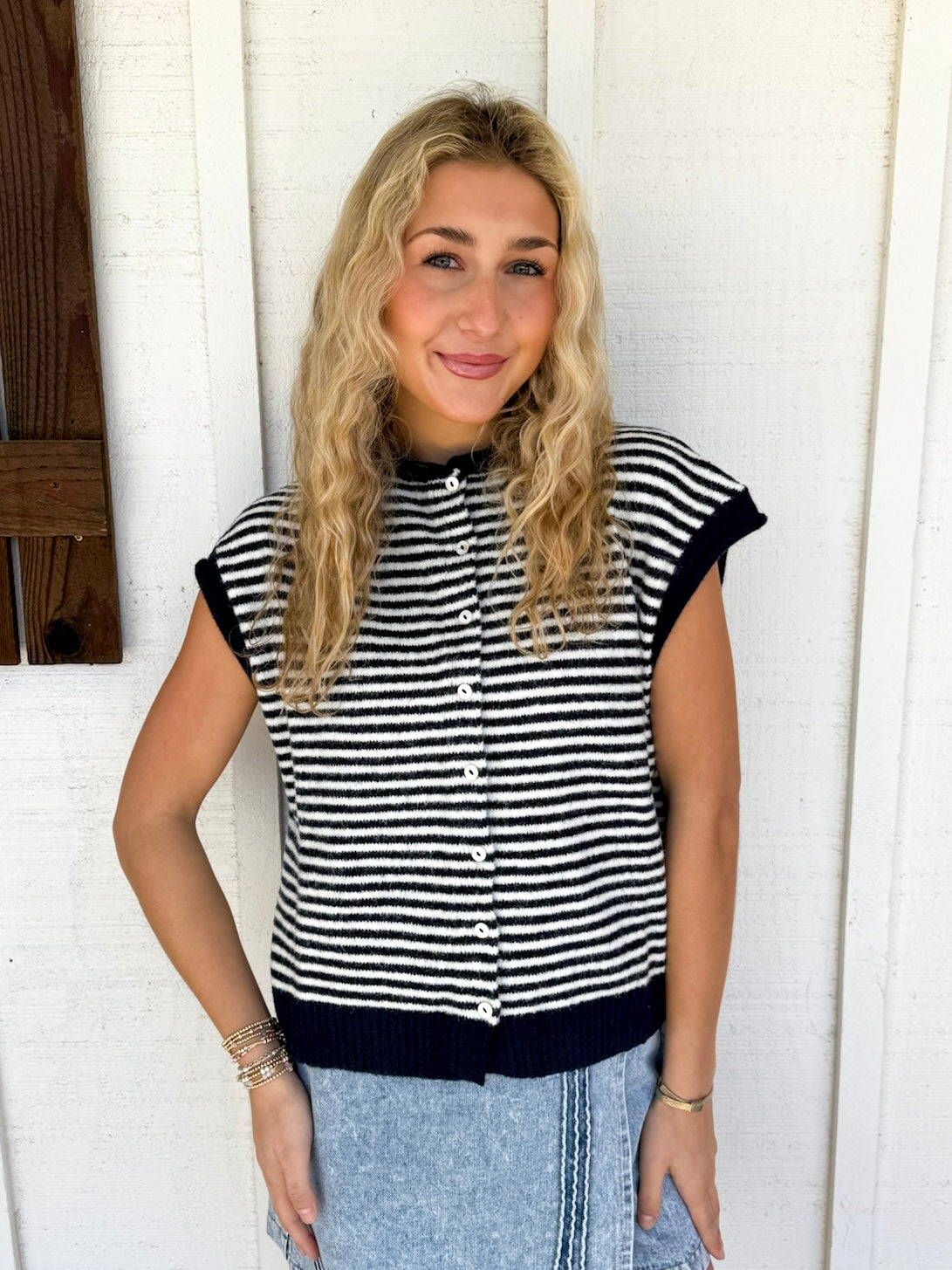 Layer up with The Gianne Cardi, a striped sweater vest cardigan that brings effortless charm to any outfit. Featuring a playful striped pattern and a signature rolled hem detail, this versatile piece transitions seamlessly from casual weekends to polished weekday looks. Perfect for throwing over your favorite tee or dress, it's the cozy essential that makes getting dressed fun.