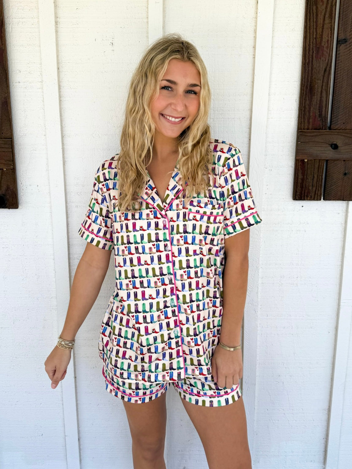 Brighten bedtime with The Cowgirl Dream Pajamas, a colorful boot-inspired short set that turns sleep into a fun adventure. Soft, breathable fabric keeps you comfy all night, while playful prints spark your imagination for sweet dreams. Perfect for cozy nights or relaxed mornings, this set combines style and comfort with a lively twist.