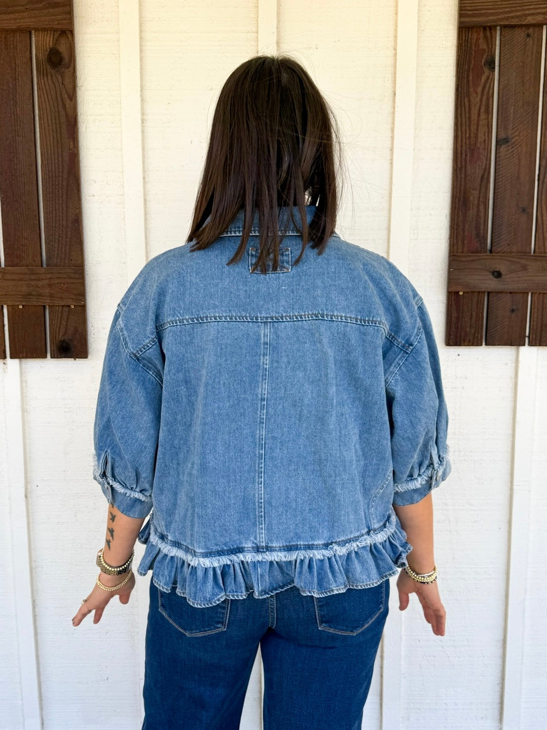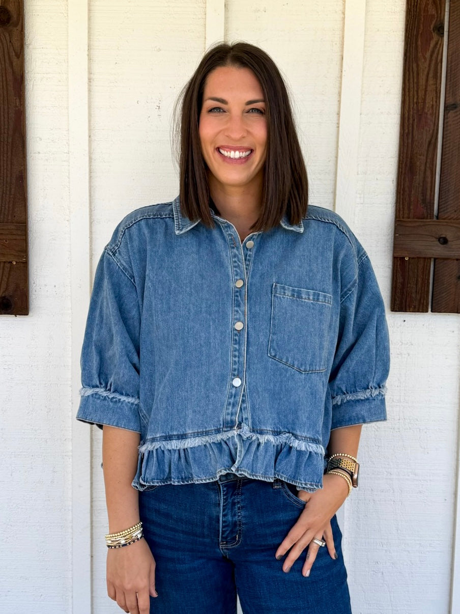 The Herbie Top is your go-to denim shirt for effortless style with personality. Crafted from classic denim, this versatile piece features charming frill details that add a playful twist to your everyday look. Whether you're dressing it up for a night out or keeping it casual with your favorite jeans, The Herbie Top delivers comfort and character in one. A wardrobe essential that proves denim never goes out of style.