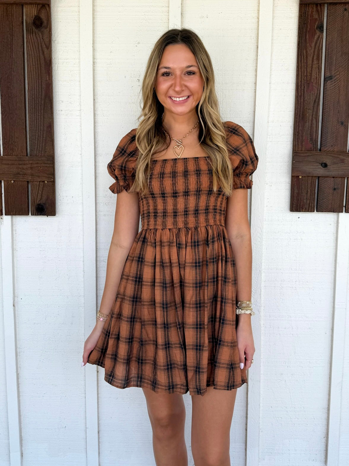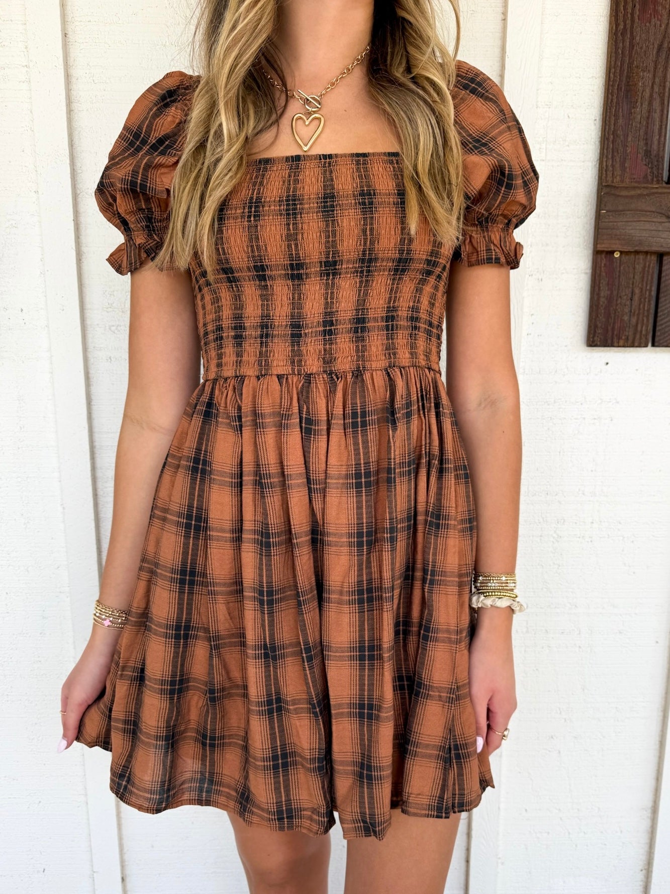 The Calypso Dress brings a playful twist to classic charm with its square neckline and flirty short puff sleeves. Elastic cuffs add a comfy touch, while the smocked bodice shapes a flattering silhouette. The airy A-line mini skirt in a lively plaid pattern makes it perfect for sunny days and spontaneous adventures. Step out feeling fun and effortlessly stylish!