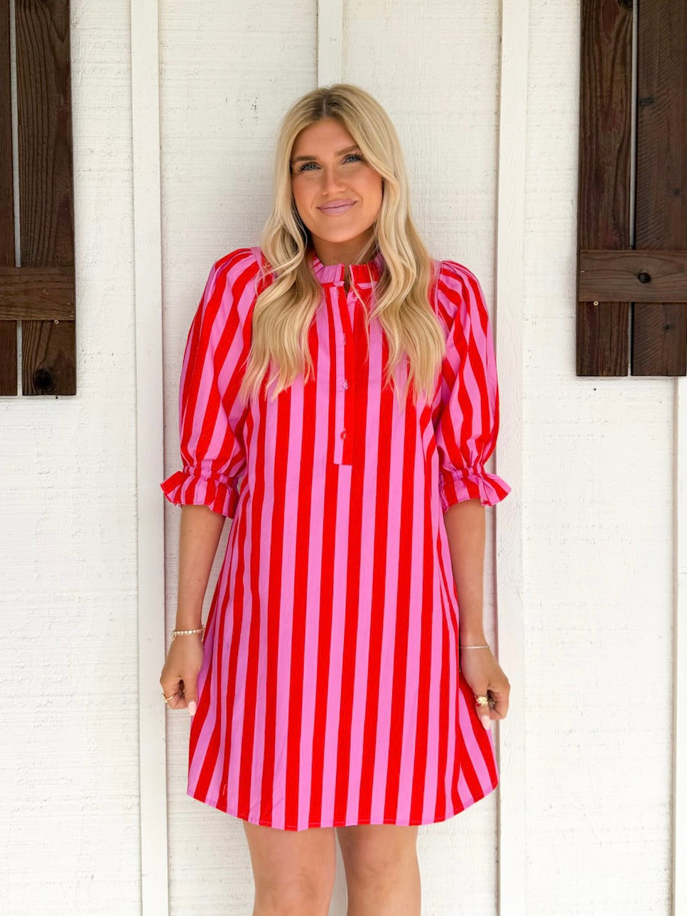 The Nyla Dress combines vintage-inspired details with modern versatility. This striped mini features distinctive 3/4 puff sleeves and a charming ruffled band collar that frames the neckline beautifully. The partial front button closure pairs with a self-tie back waist for a flattering, adjustable fit. Crafted from lightweight woven fabric with a full lining for comfort and coverage, this dress moves effortlessly from casual outings to elevated occasions. Non-sheer construction ensures confidence with every wear.