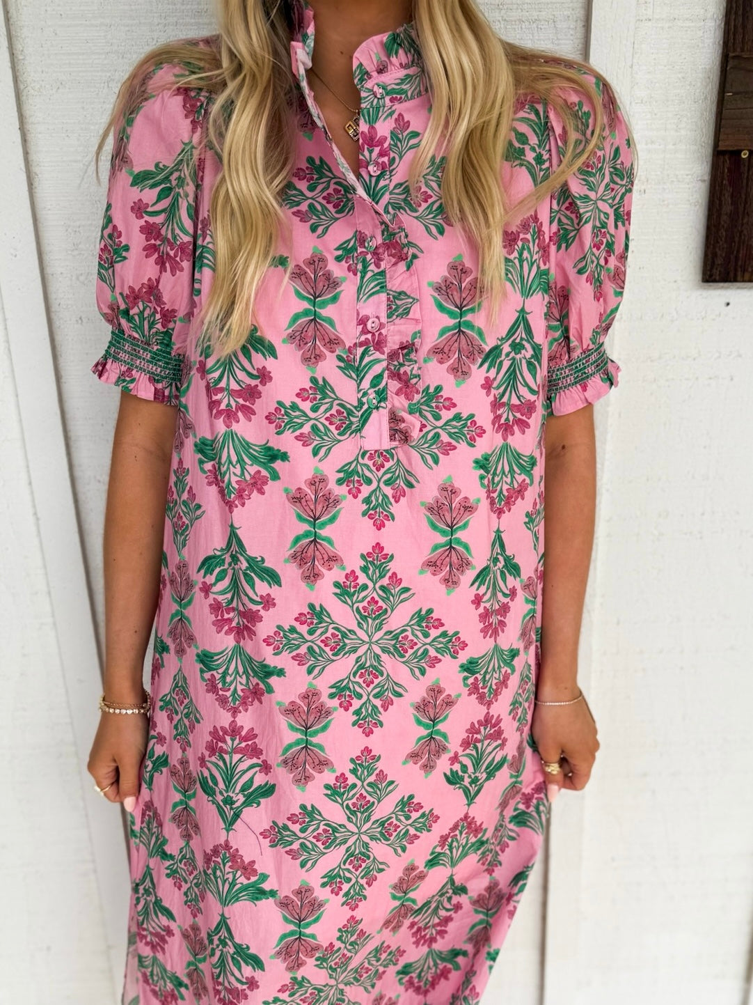 The Remington Dress showcases a refined botanical print on lightweight woven fabric, designed for effortless elegance. Short puff sleeves frame the shoulders while a ruffled collar and button-front closure add vintage-inspired charm. Smocked cuffs provide subtle texture and definition at the wrists. Practical side pockets offer everyday functionality, while the lined construction ensures comfort and opacity. This midi-length silhouette strikes the perfect balance between polished and relaxed, making it an ideal choice for warm-weather occasions.