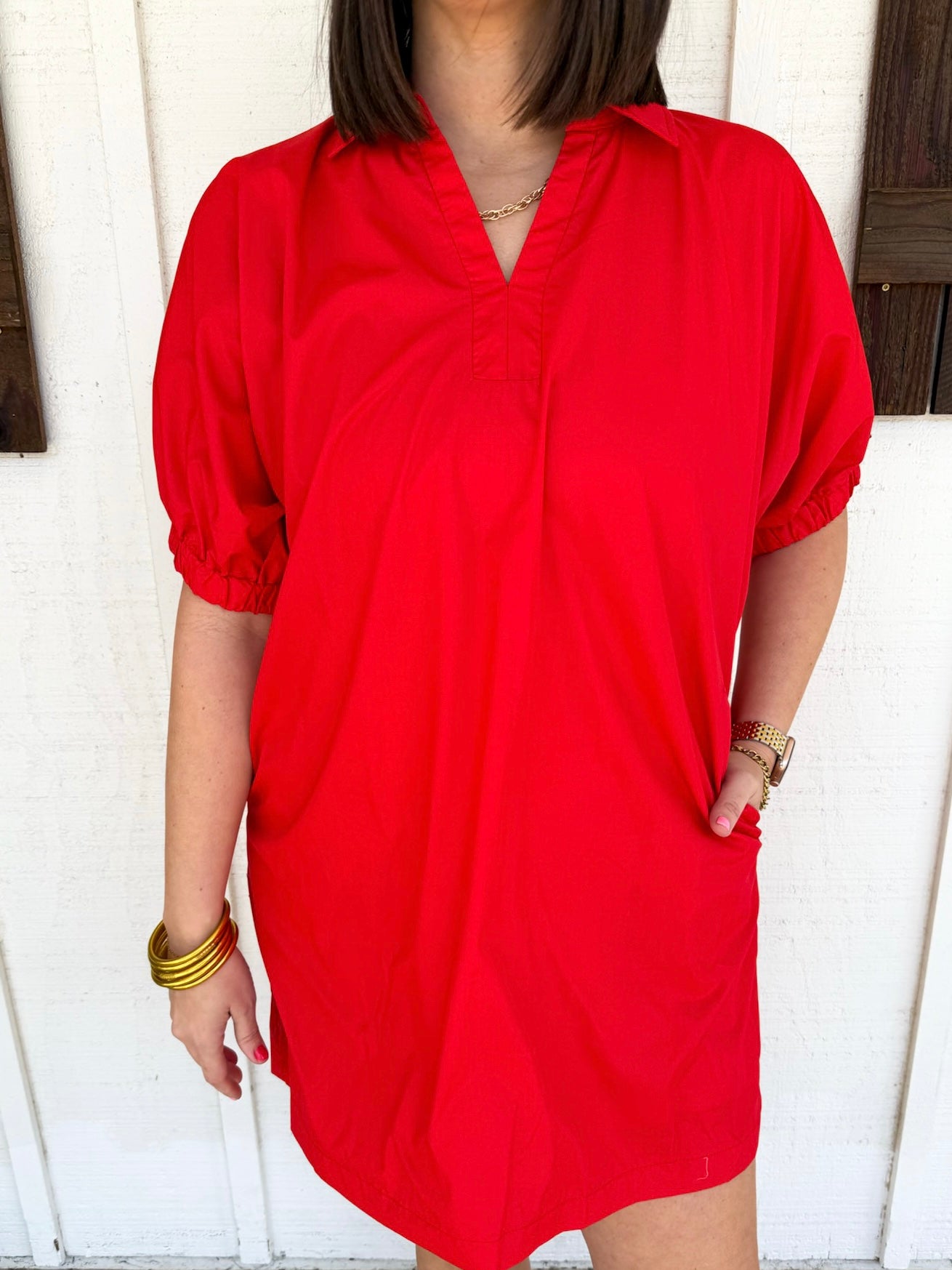 The Winston Dress is your go-to piece for effortless style. This classic shift silhouette flatters every frame with its timeless design, while the v-neckline and collared detailing add sophisticated charm. Delicate mini puff sleeves bring a touch of feminine flair, and practical pockets keep you organized throughout your day. Whether you're heading to brunch, running errands, or meeting friends, this versatile mini dress transitions seamlessly from casual to polished. Comfortable, chic, and endlessly wearable—The Winston is the everyday essential you'll reach for again and again.