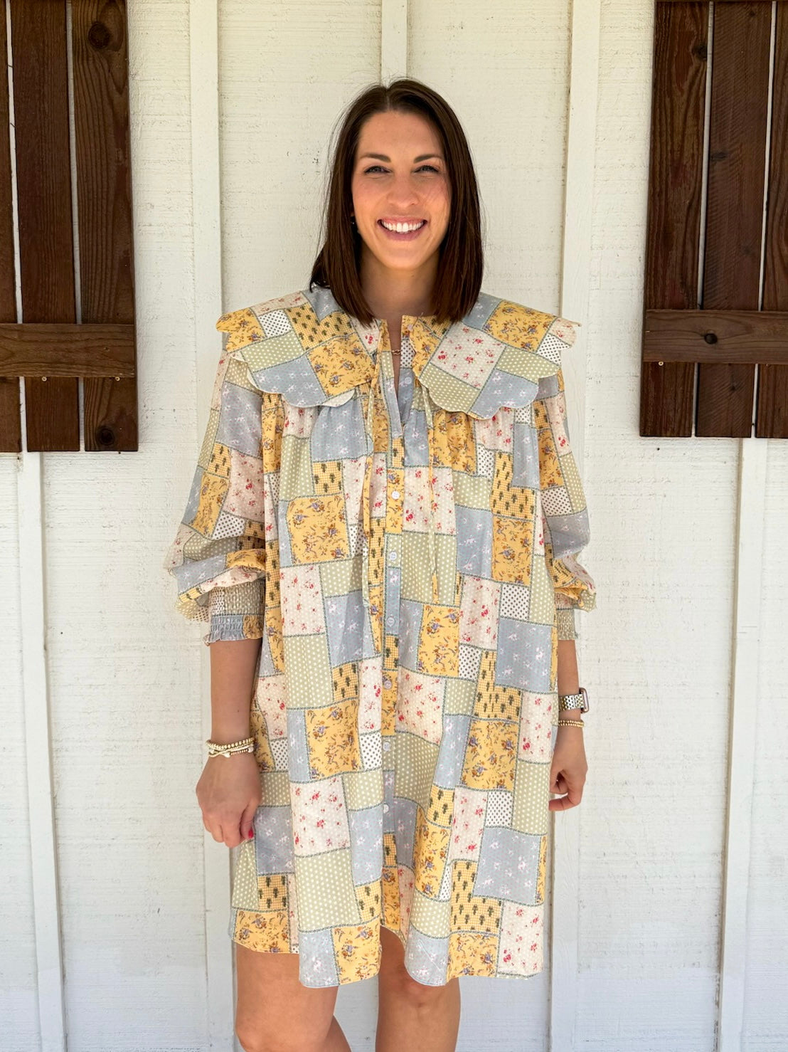 The Tracy Dress is an adorable mini dress featuring a charming tile print and a sweet scallop collar that adds a playful touch. Perfect for casual outings or weekend adventures, this dress combines comfort with a fun, flirty vibe. The scalloped neckline frames the face beautifully while the mini length keeps things breezy and light. Whether you're heading to brunch or running errands around town, this dress is your go-to pick for looking effortlessly cute and put-together.