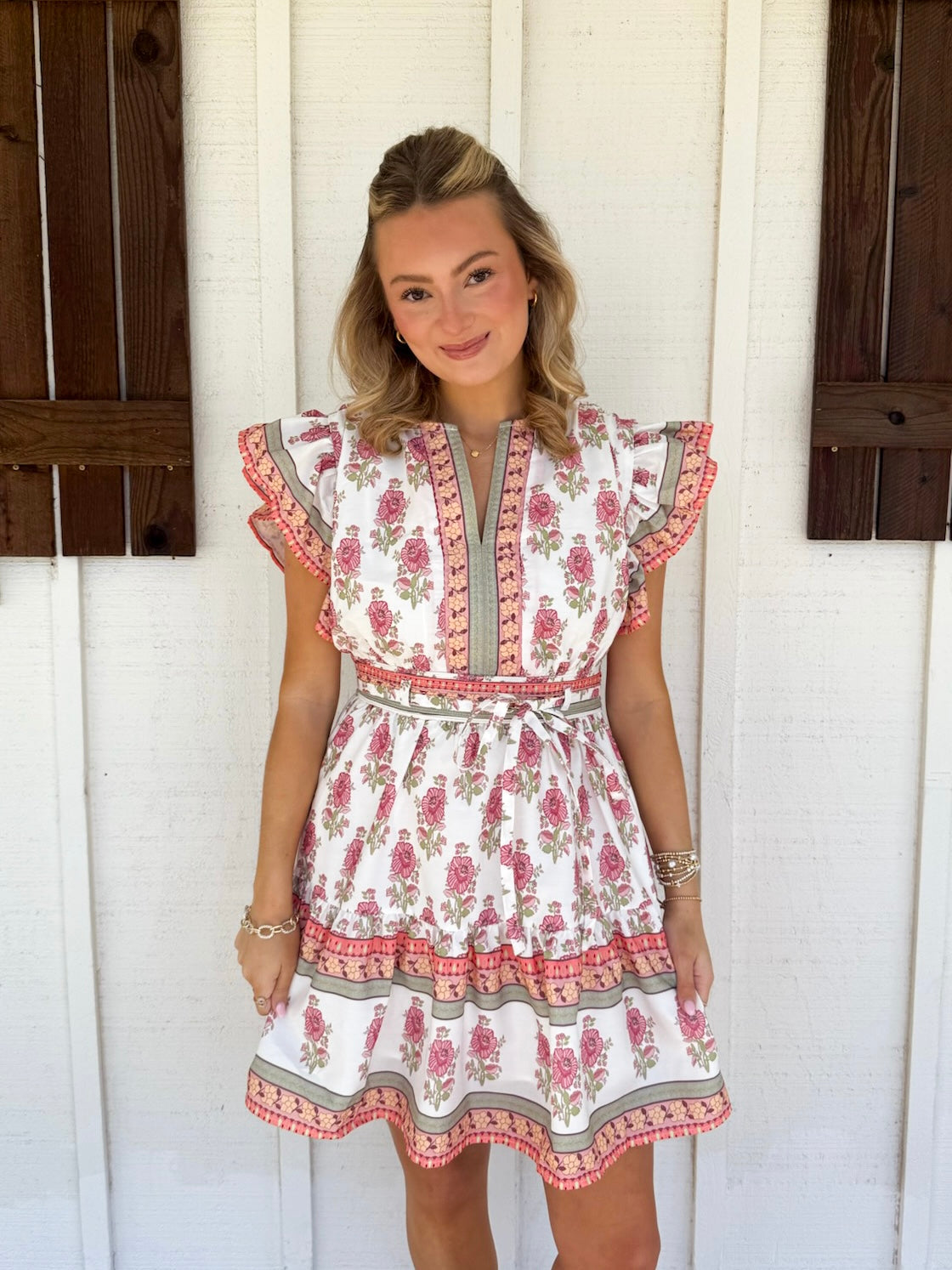 The Jonnie Dress captures effortless elegance with its charming silhouette and thoughtful details. Crafted from crisp cotton poplin, this babydoll midi features a flattering V-neckline with placket split, delicate flutter ruffle sleeves, and a tiered mini skirt that moves beautifully. The vibrant floral block border print adds visual interest, while practical side pockets and belt loops enhance functionality. A cinched waist with elastic backing and removable tie allows you to customize the fit, and the lined construction ensures comfort and coverage. Perfect for transitional seasons, this dress balances playful femininity with refined sophistication.