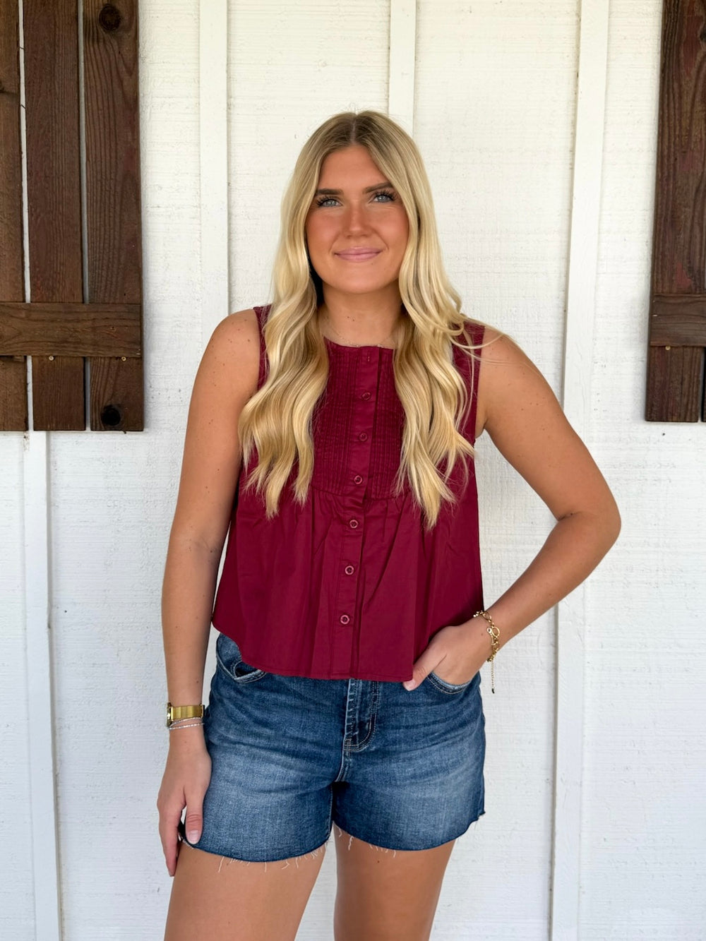 The Rya Top is a sleeveless button-down designed with refined pleated detailing across the chest, offering subtle texture and sophistication. Its flowy hem enhances movement and comfort, making it an ideal choice for layering or wearing on warmer days. This top combines tailored elements with relaxed ease for versatile styling.