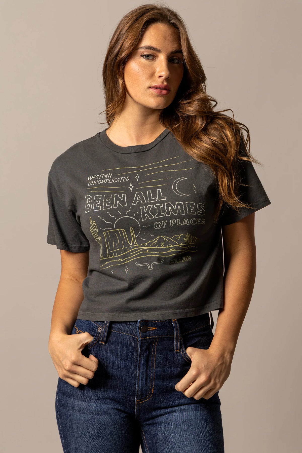 For the girls who’ve gone the distance—and looked good doing it. The Places Cropped Tee features a bold Western graphic and the phrase “Been All Kimes of Places”—a nod to every backroad, arena, and wide-open stretch you’ve called your own. With a relaxed fit and cropped cut, it’s made for road trips, rodeos, and wherever your boots take you next.