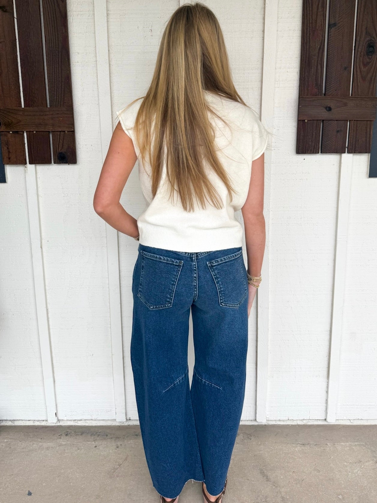 Taylor in Dark Denim is wearing a size Small. Height is 5’6”, Bust is 32, Waist is a 24.
