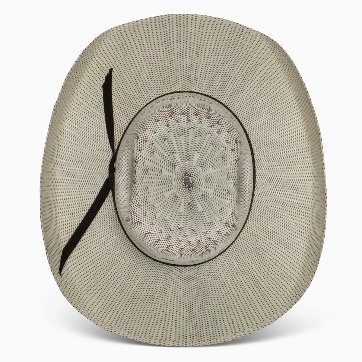 Part of our Tuff Hedeman Collection, the Everett Cowboy Hat is a straw hat with a 5 1/4" rounded brick crown, a 4 1/4" brim, a cloth sweatband, and a simple ribbon hatband. Irregular chocolate-brown stitchwork on the crown gives the Everett a ragged, beat-up look, just the thing for a champion bull rider.