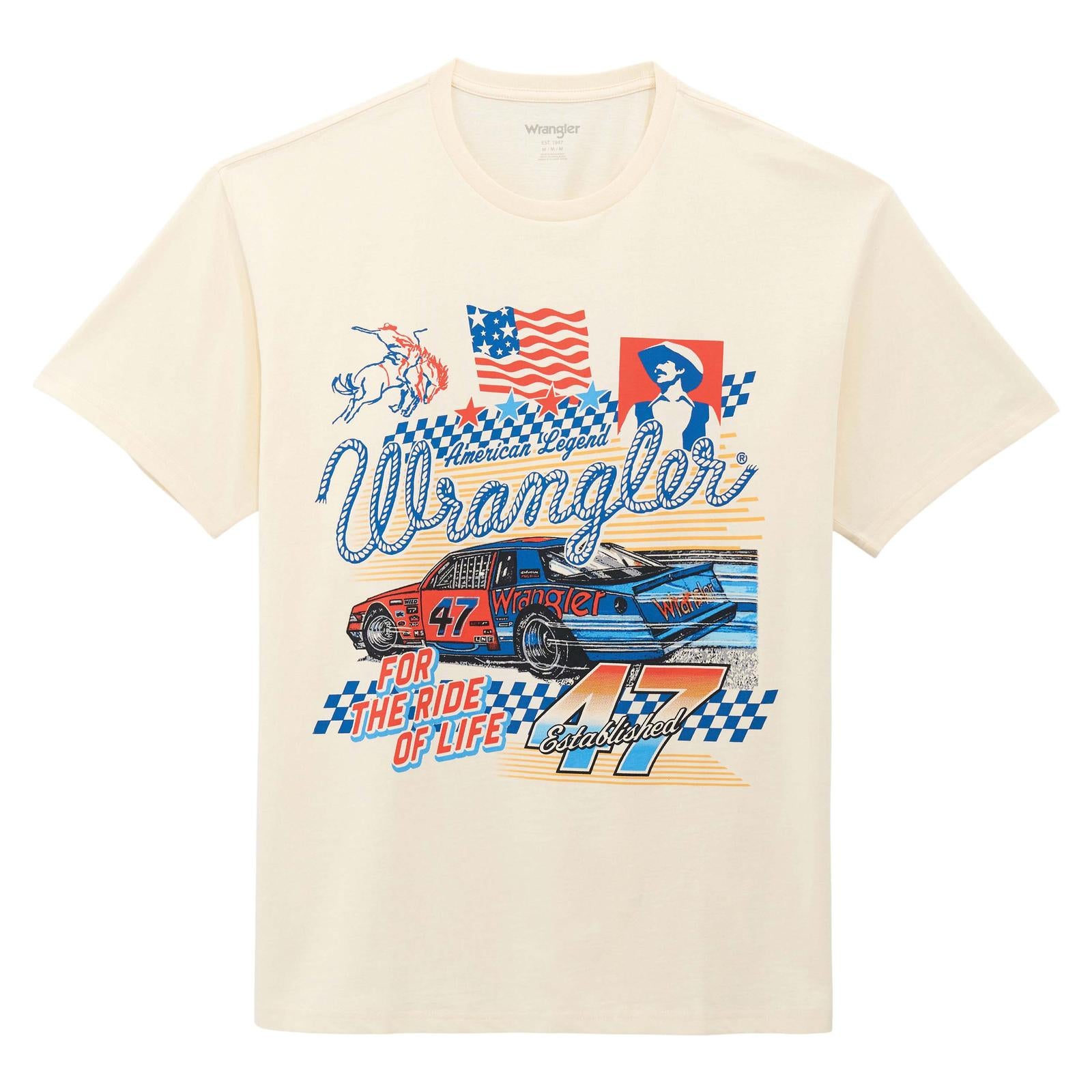Clean, classic, and tied to the thrill of the track, the Wrangler Men’s White Race Car Graphic T-Shirt brings racing heritage into everyday rotation. Soft 100% cotton and a traditional, easygoing fit keep it comfortable from start to finish. Up front, Car 47 teams up with the Wrangler rope logo for a graphic that blends speed-driven energy with the grit of a brand long connected to horsepower and hard-earned tradition.