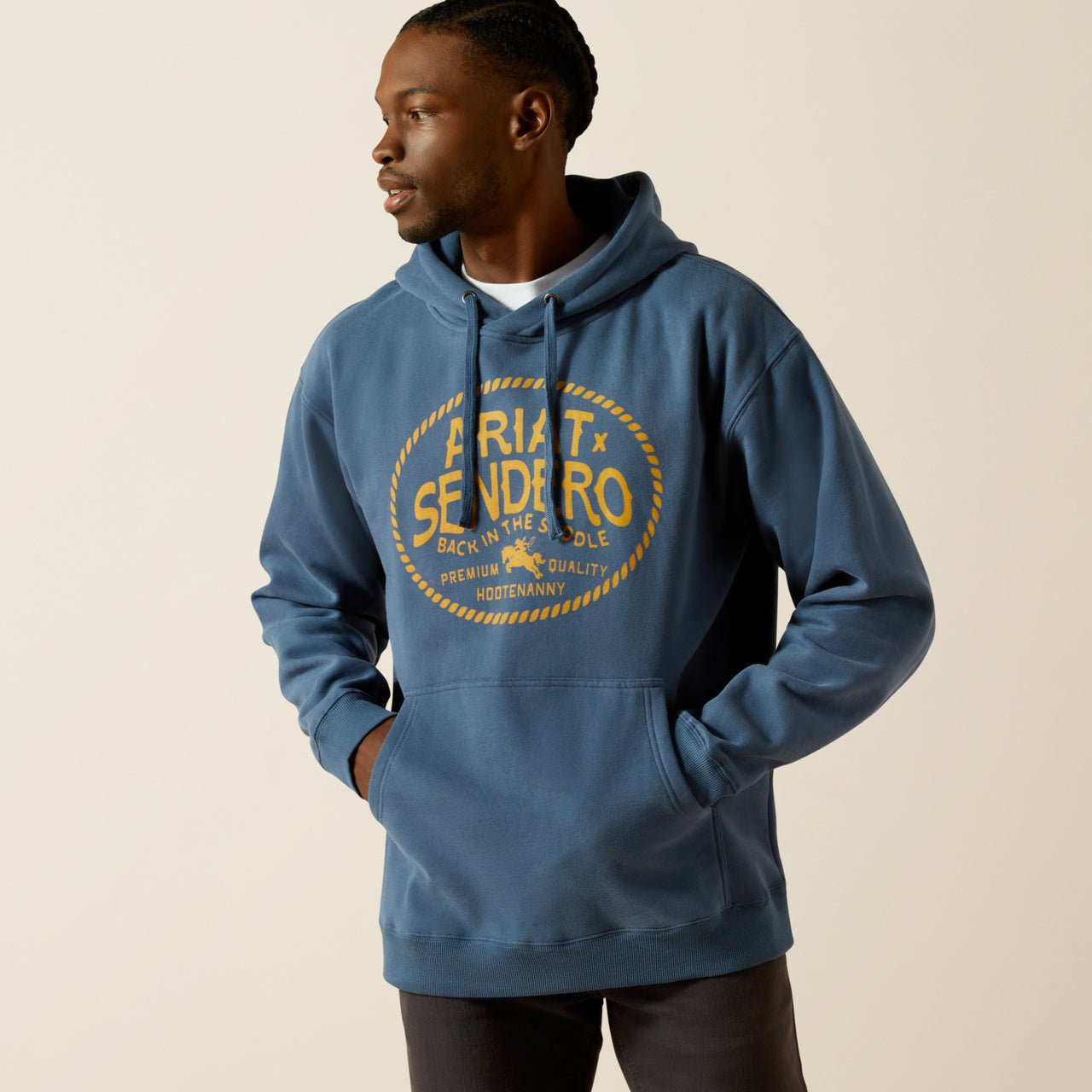 Stay cozy and cool in the Ariat x Sendero Men's Back In The Saddle Hoodie. With its adjustable three-piece hood lined in soft jersey, this hoodie keeps you warm without weighing you down thanks to breathable brushed fleece. The kangaroo pocket is perfect for stashing essentials or warming your hands during adventures. Designed in standard men’s sizes but made for everyone—just grab a size down if you’re a woman ready to claim this as your new favorite everyday go-to. Made from a comfy cotton-poly blend, it’s the perfect fit for your next ride or relaxed day out.