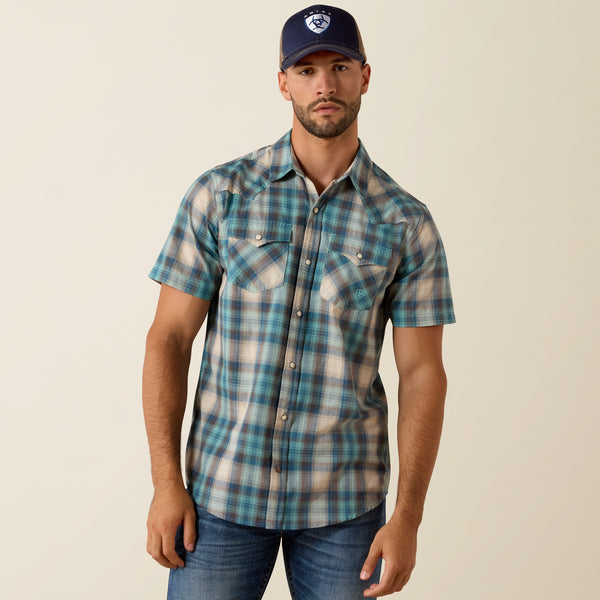 Ariat's Retro Halden Fitted Shirt combines classic Western style with modern comfort. Featuring double-snap cuffs for effortless rolling, a distinctive bull horn snap-front closure, and signature Ariat branding, this shirt delivers authentic ranch appeal. The tailored slim fit works through the body with generous length for tucking, while the Western yoke and pocket detailing add character. Crafted from 100% cotton for breathability and durability, it's the perfect choice for work or weekend wear.