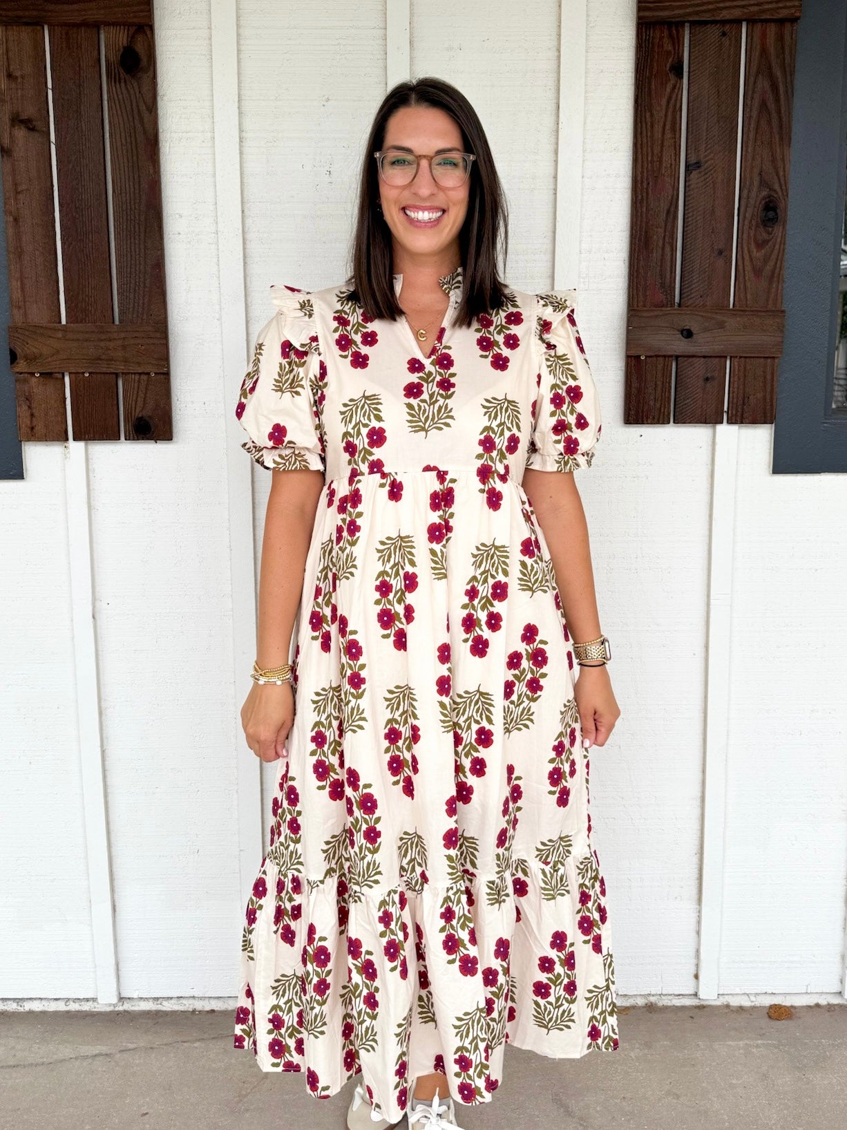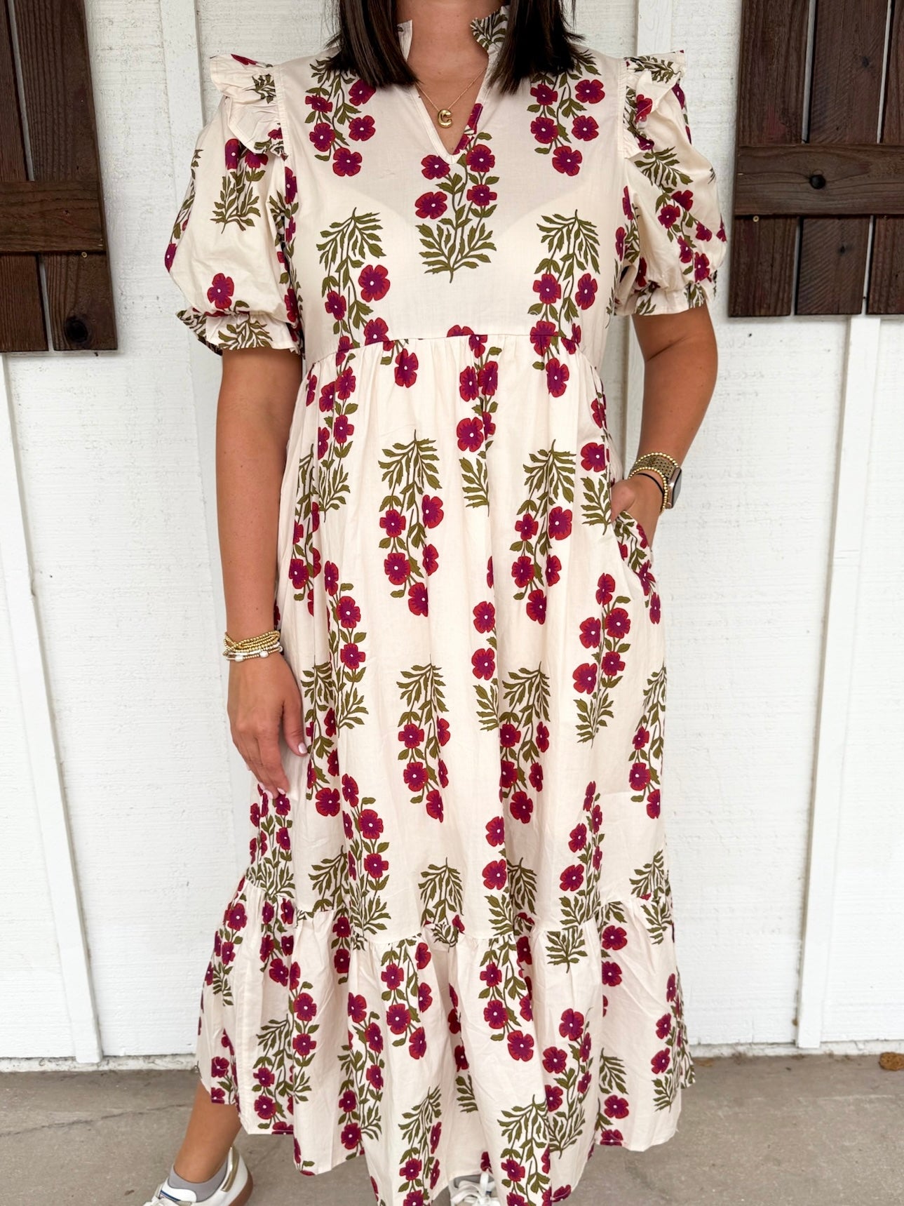 The Duncan Dress brings a playful burst of charm with its floral print and flirty puff sleeves. Delight in the ruffled split neckline and shoulder accents that add a whimsical touch, while elasticized cuffs keep the look fun and comfortable. The lightweight woven fabric is lined and non-sheer, perfect for twirling through sunny days. A ruffle hem and handy side pockets complete this midi dress, making it the perfect blend of style and ease for your next adventure.