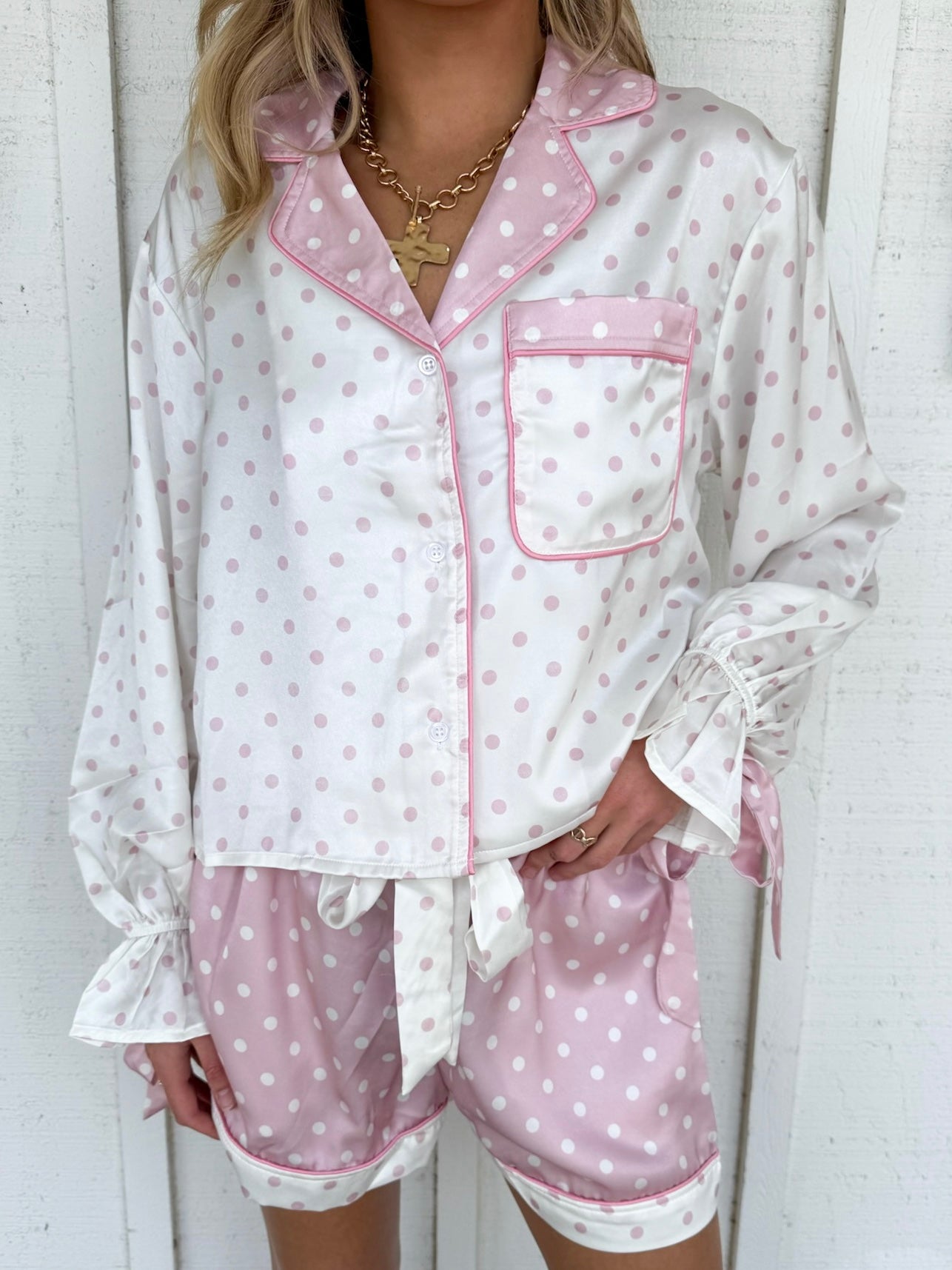 Slip into The Carmie Pajama Set for cozy nights with a playful touch. Featuring a charming polka dot print on smooth satin, this set includes a long-sleeve shirt with tied front and cuffs and matching shorts. It's the perfect blend of comfort and cute, making bedtime feel like a little celebration.