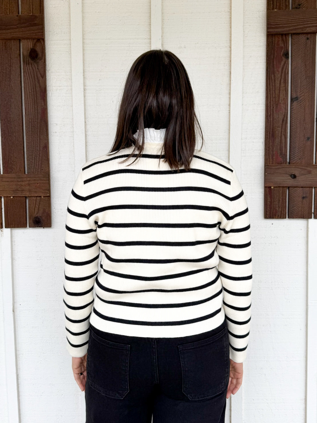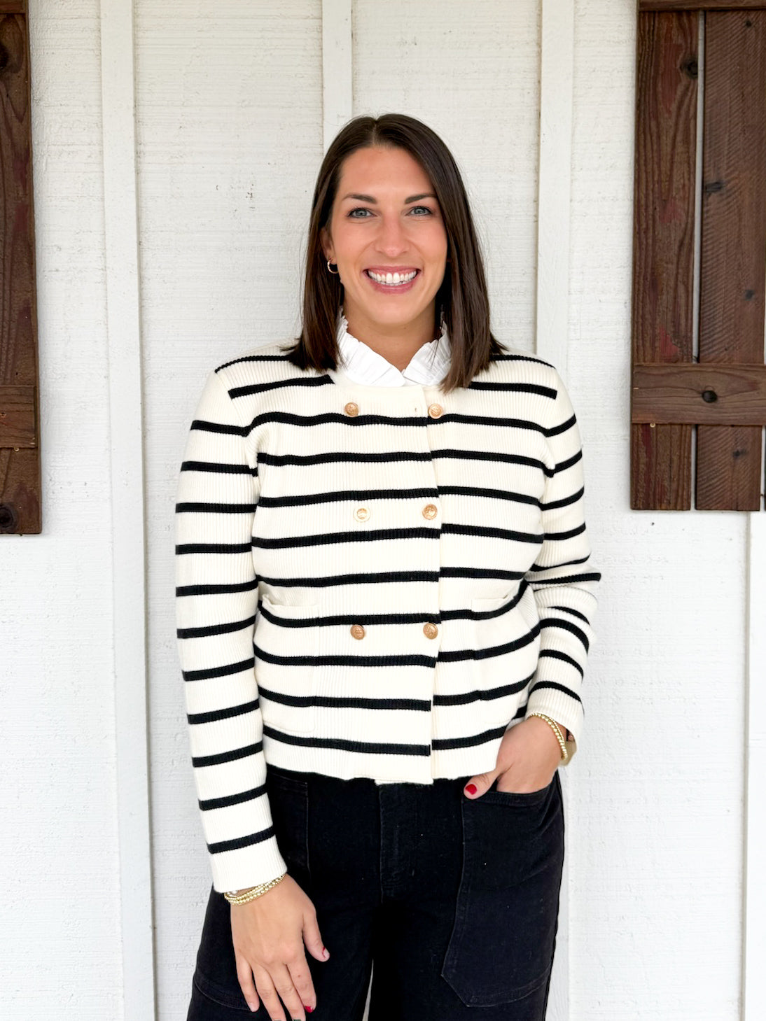 Classic stripes meet modern detail in this cardigan top, featuring button-accented sleeves and a flattering, easy-to-layer fit. Whether styled open or closed, it brings a touch of polish to everyday outfits with timeless charm.