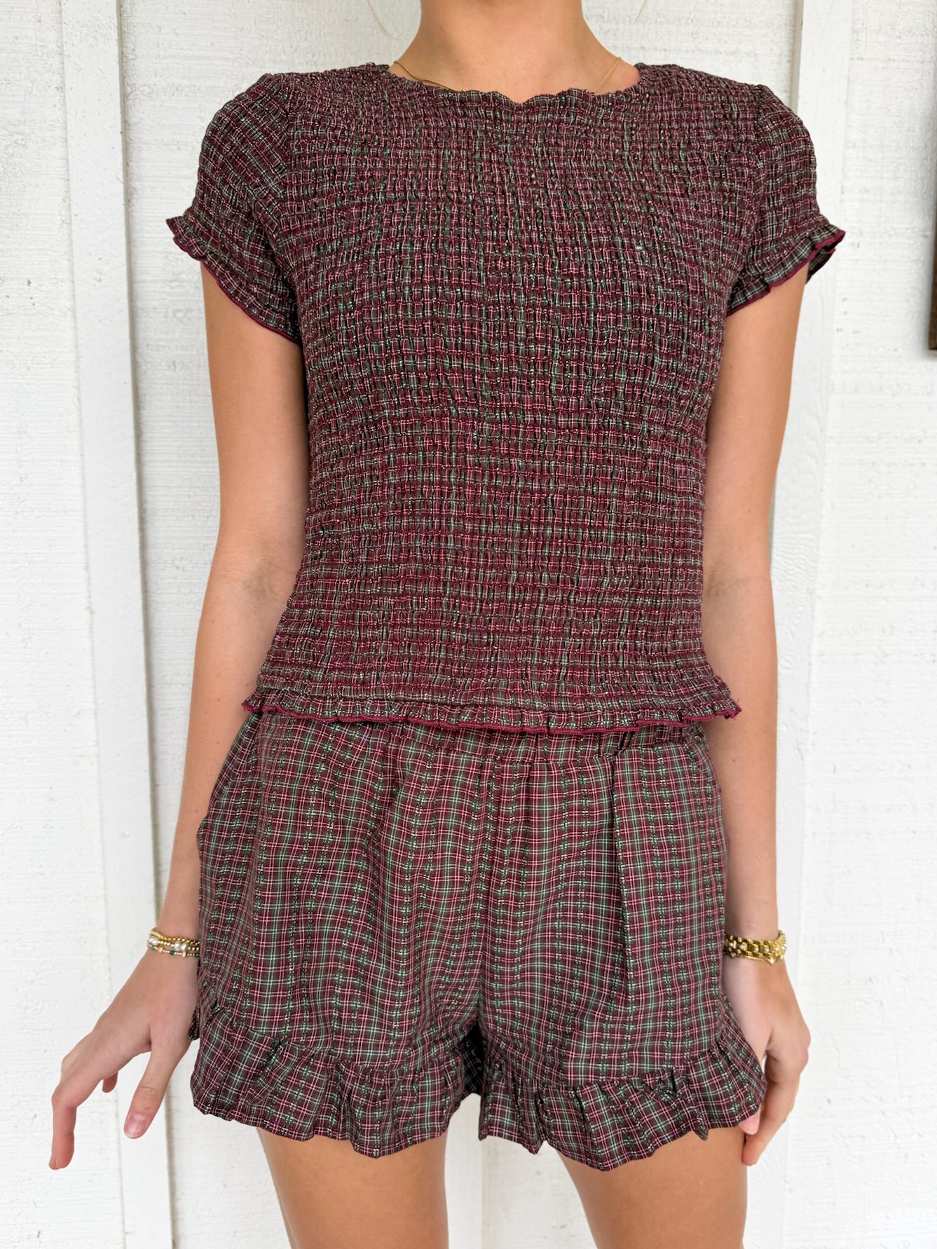 The Meena Set brings effortless charm with its smocked checkered top and gingham ruffle shorts combo. Perfect for warm days, this playful two-piece features a fitted, textured bodice that pairs beautifully with flowy ruffled shorts for a fun, feminine look. Mix-and-match versatility means you can style each piece separately or wear them together for instant outfit magic. Comfortable, cute, and ready for adventure.