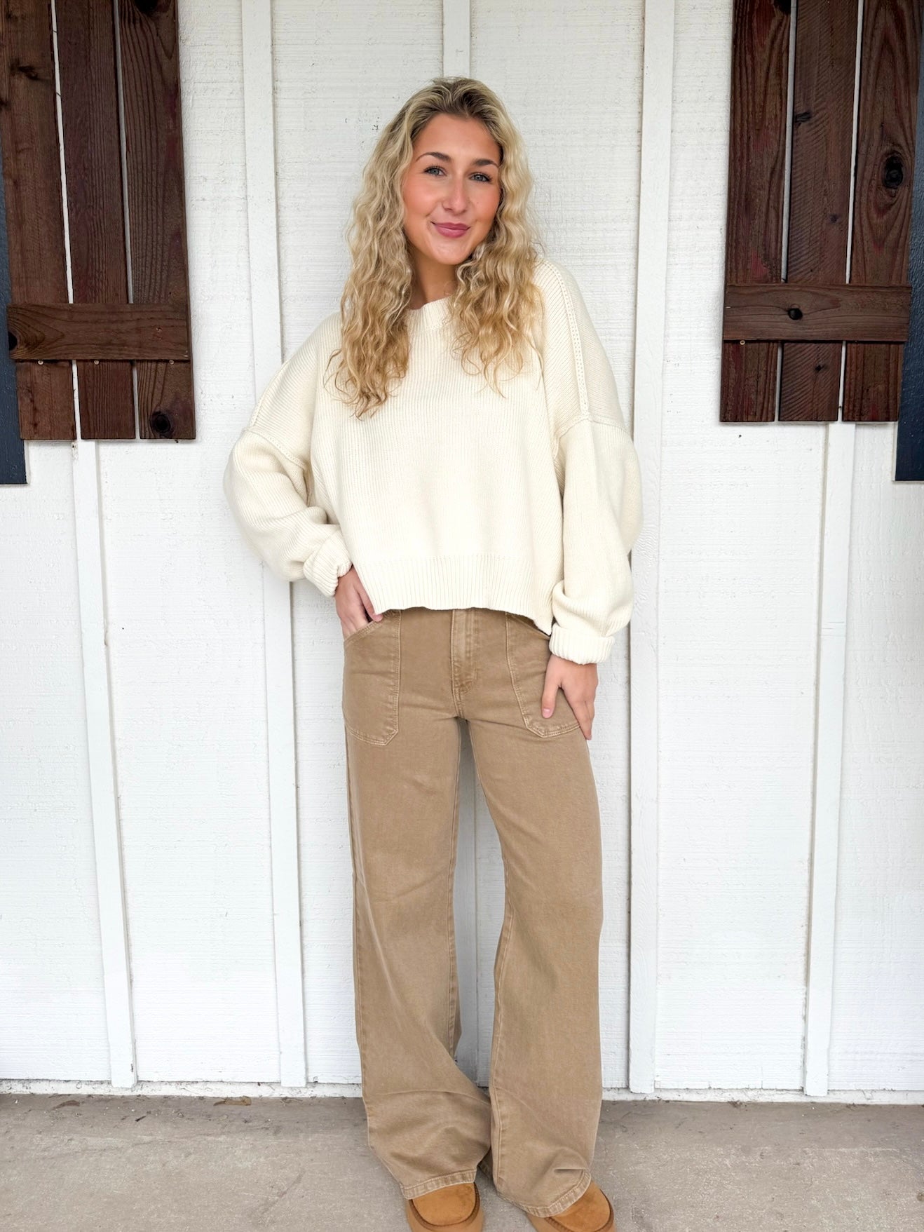 Introducing The Daylight Jeans - the perfect blend of classic utility and bold, '70s-inspired style. With vintage khaki color, flattering high-rise fit, and wide-leg silhouette, these jeans elongate the legs and make a statement in any wardrobe. Don't miss the flare at the ankle for added flair.