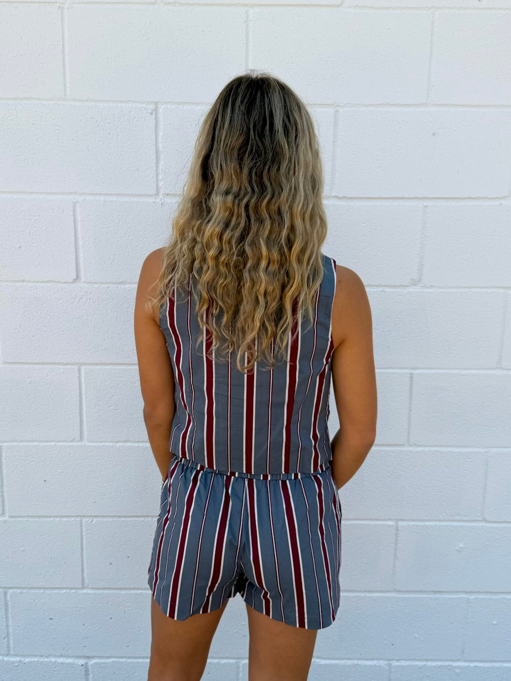 Get playful with The Fernie Set—a charming duo combining cute boxer-style shorts and a lively tie vest. Featuring a vibrant retro striped pattern, this set brings a fresh, fun vibe perfect for adding a splash of personality to any outfit.