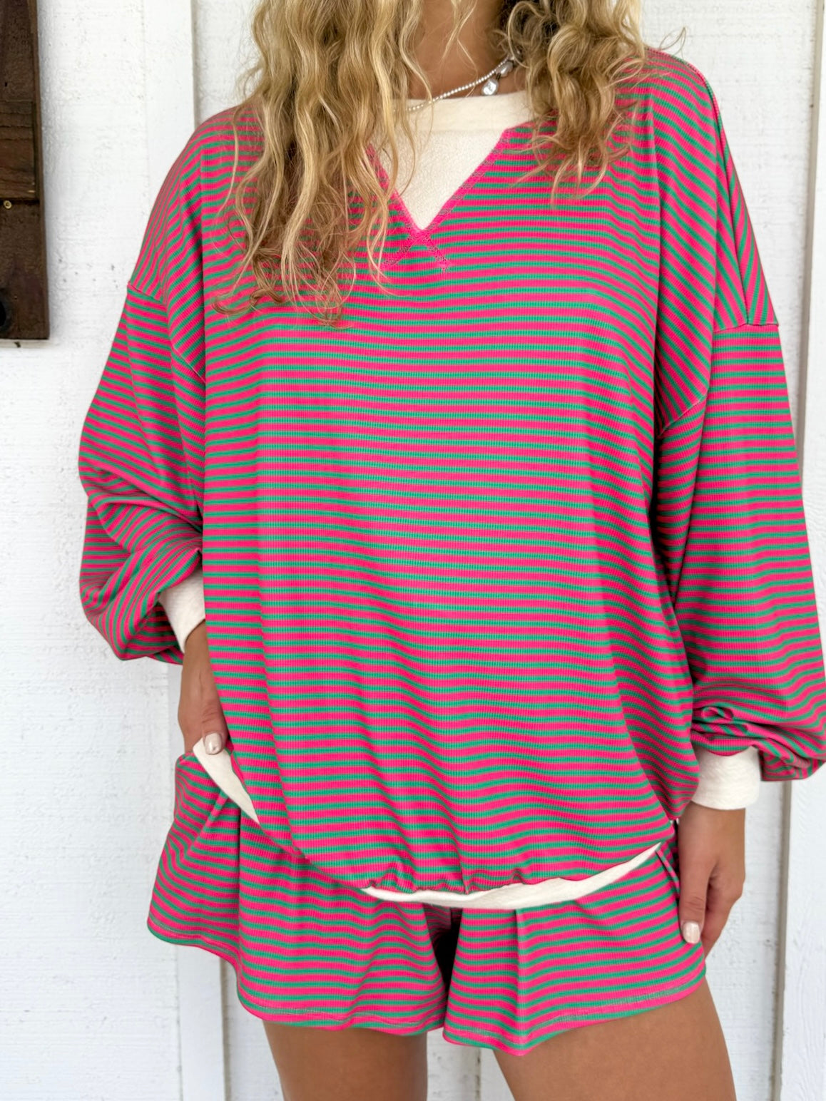 The Feryn Set adds a fun twist to your casual wardrobe with its playful contrast ribbed stripe detail. Soft and cozy, it’s perfect for those laid-back days when comfort meets style. Pair it with your favorite jeans for an effortlessly cool look that’s ready for anything.
