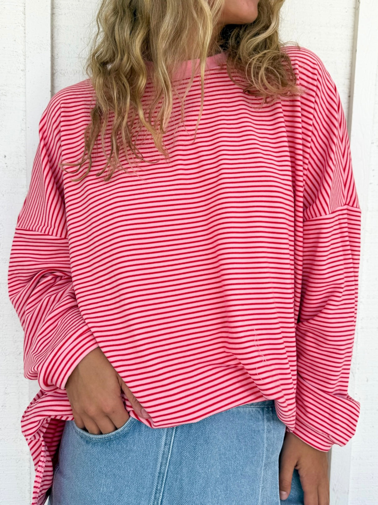 Cozy up in The Louisa Top, your new favorite oversized fleece with playful stripes that add a fun twist to comfort. Perfect for lounging or casual outings, its soft fabric keeps you warm while the roomy fit lets you move freely. Embrace relaxed style with a cheerful vibe!