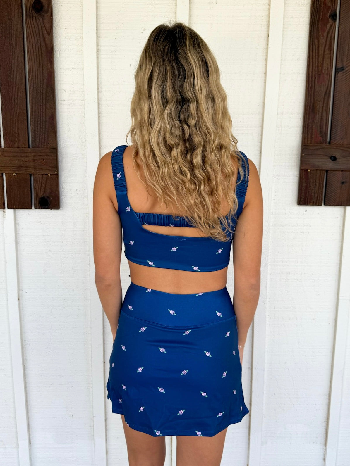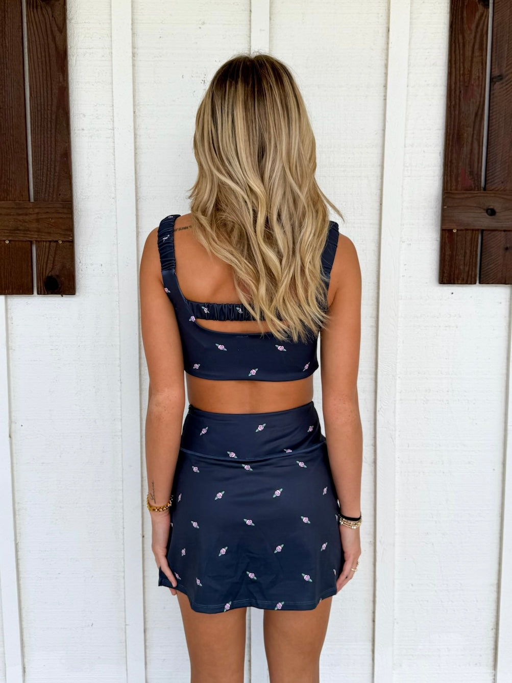 Embrace sporty chic with The Hollis Set, featuring a Rose Print Performance A-Line Skort designed for comfort and style. Its built-in shorts offer confidence and coverage, seamlessly transitioning from your workout to weekend plans. Paired with a rose print bra top that has removable padding, an open-back, and scrunch straps, this set delivers an adjustable, flattering fit. Lightweight and breathable, The Hollis Set combines feminine flair with active ease for your most playful days.