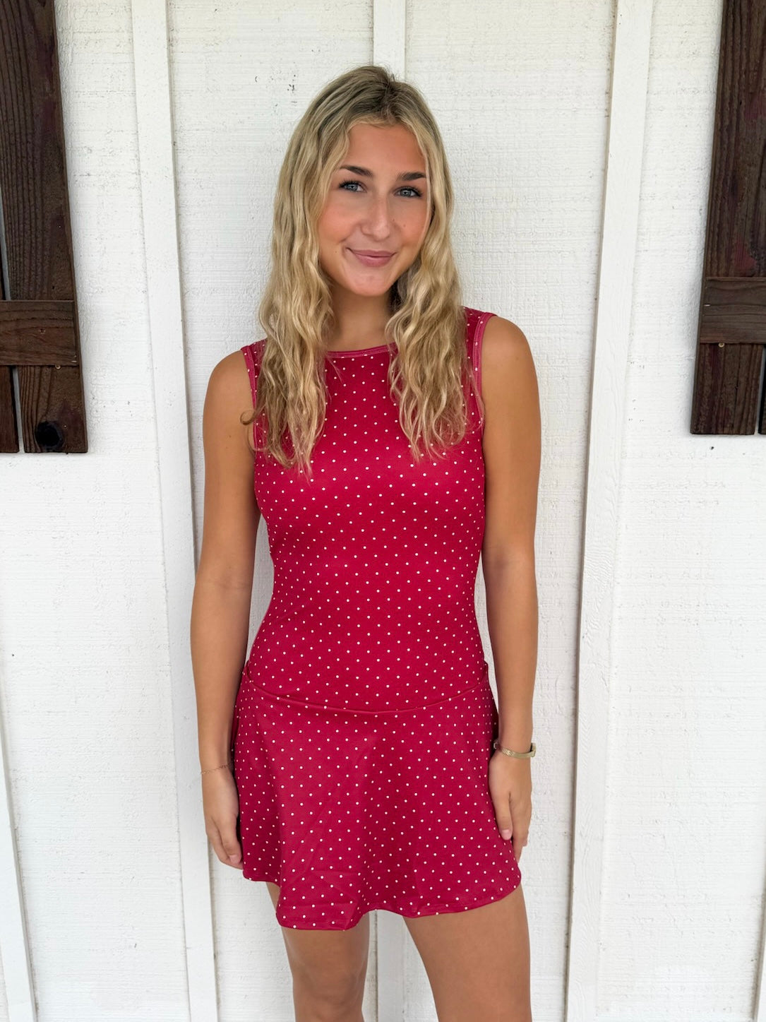 The Kensla Dress features a modern drop waist and breezy silhouette for easy, all-day wear. Its soft stretch-knit fabric moves with you, making it perfect for running errands, brunch dates, or casual workouts. Playful polka dots add a sporty twist to your athleisure look, blending comfort with fun style effortlessly.