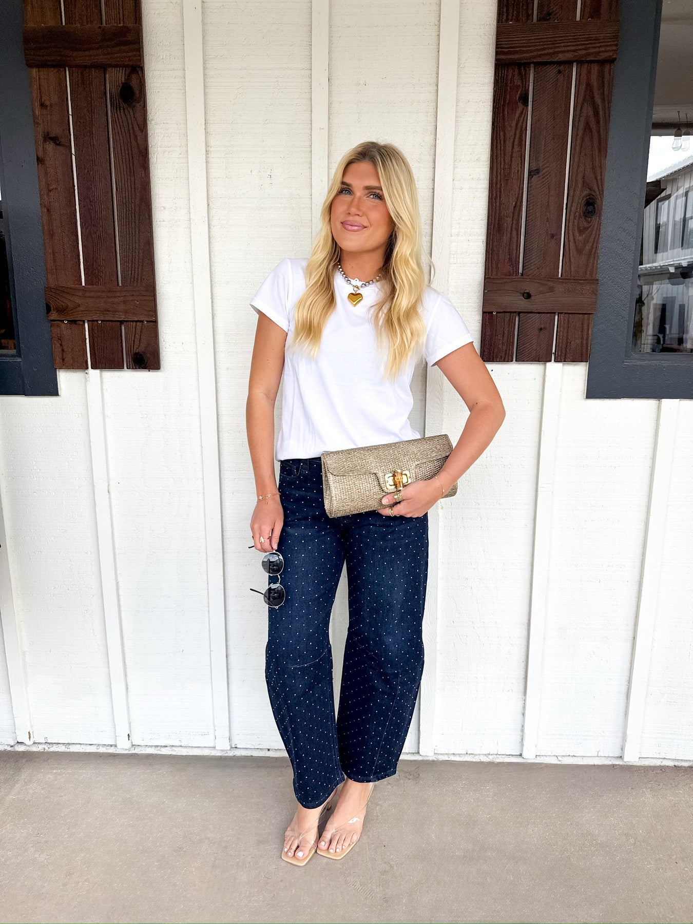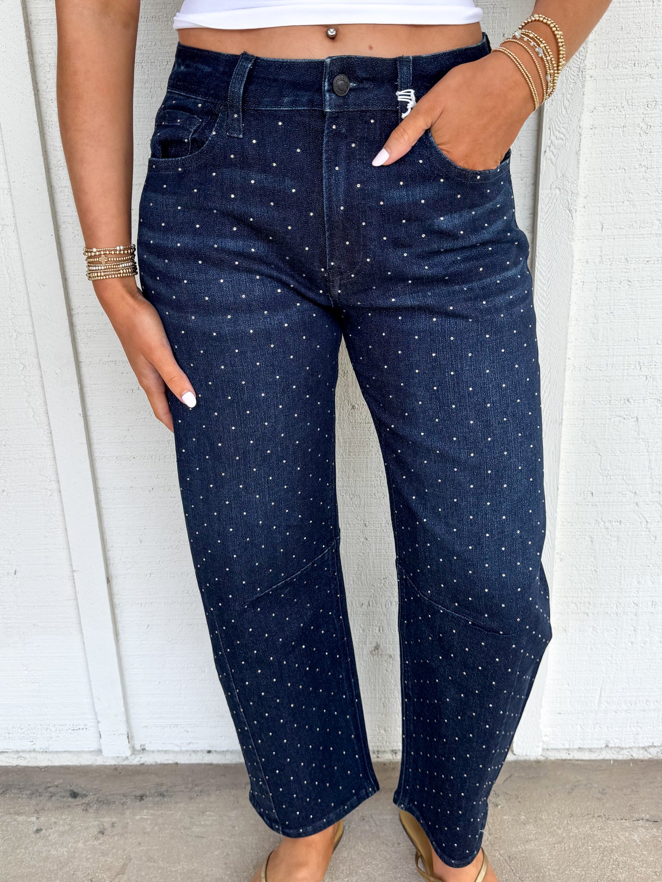 The Eastlyn Jeans deliver comfort without compromise. Crafted from stretch denim, these high-rise barrel jeans feature a cropped length that hits just right. Dark wash fabric pairs beautifully with black diamond rhinestone embellishments for a touch of sparkle. Finished hem and that signature comfort stretch mean you'll reach for these again and again. Effortless style that actually feels as good as it looks.
