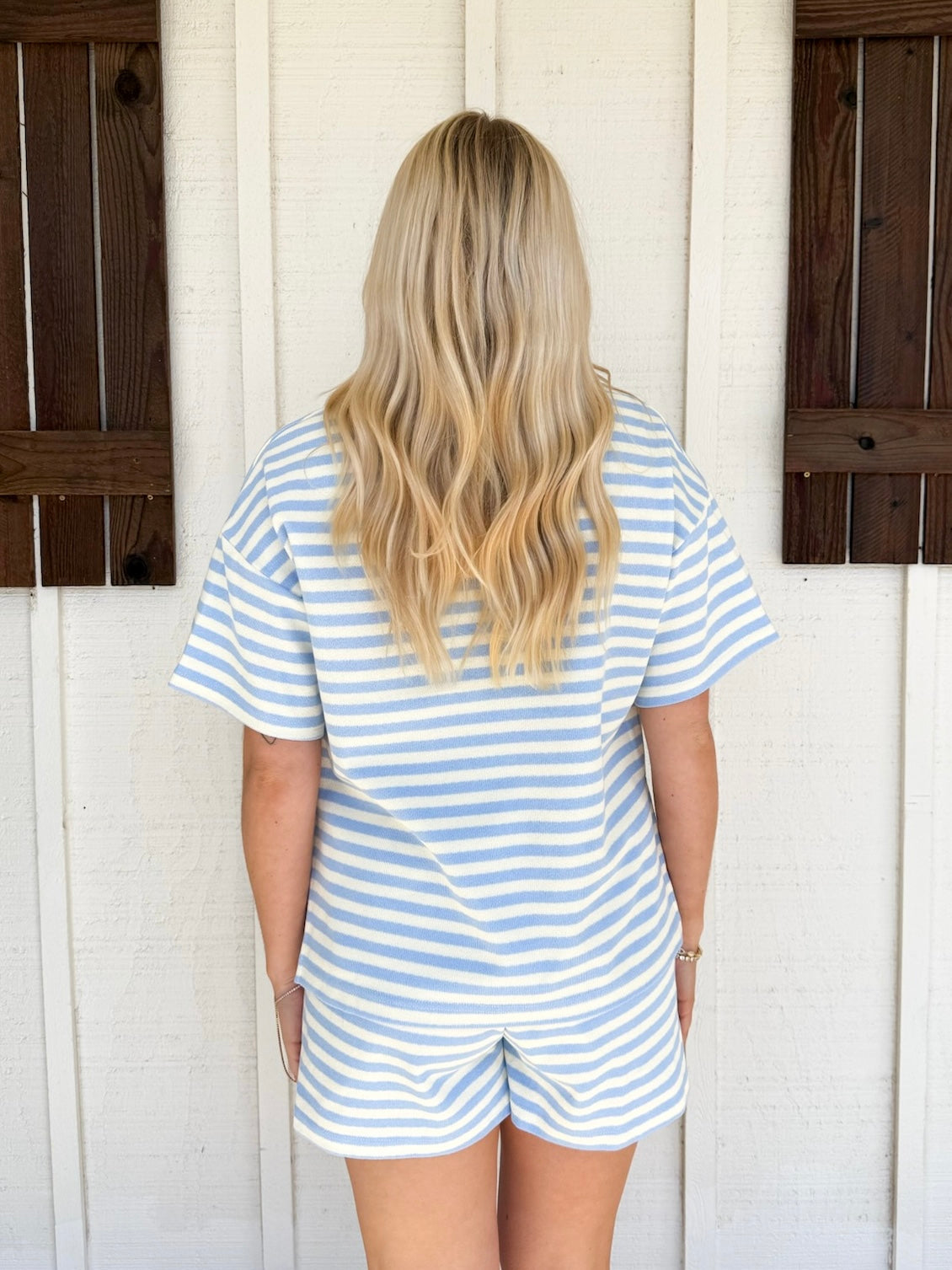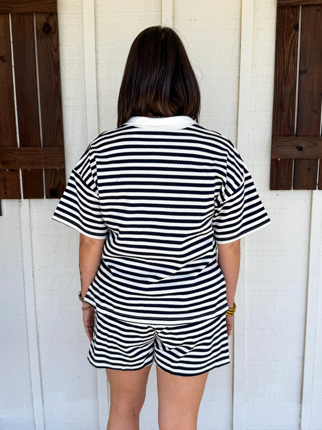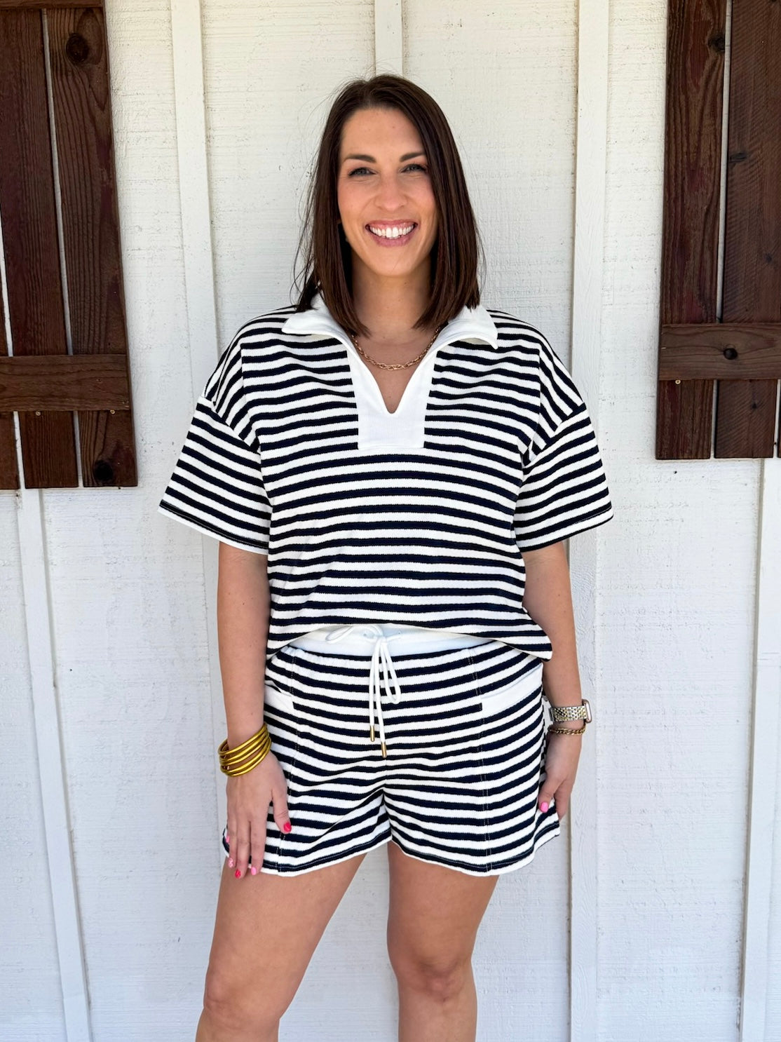 The Monarch Set combines effortless style with practical comfort. This two-piece ensemble features striped knit shorts with a drawstring waist and functional front pockets, paired with a coordinating short-sleeve top showcasing a contrast collar V-neck. Crafted from lightweight knit fabric that's non-sheer and unlined, both pieces move with you throughout the day. Perfect for warm-weather dressing, this set delivers versatile layering potential while maintaining a polished, put-together aesthetic.