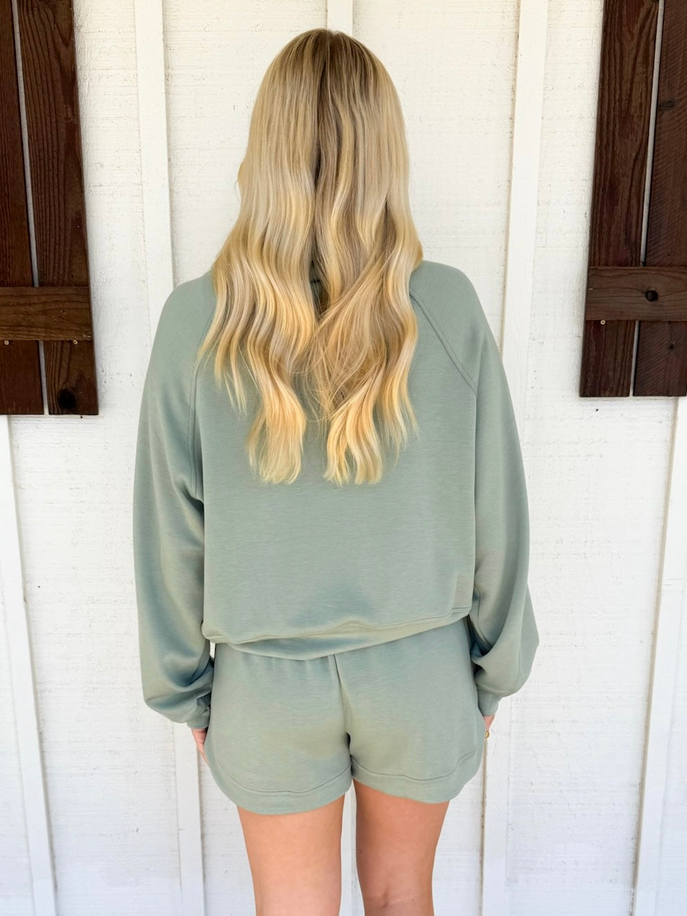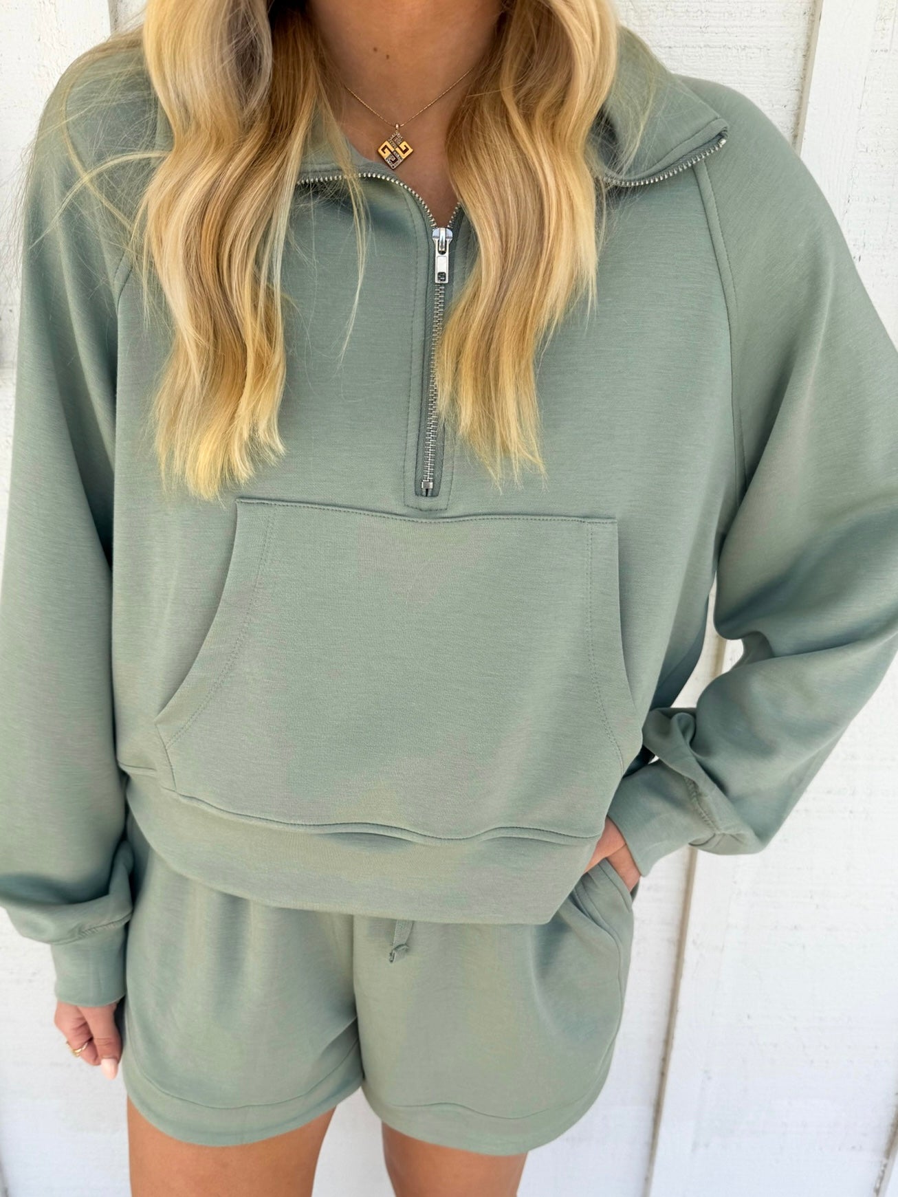 This contemporary oversized-fit sweatshirt features a high collar with a convenient half-zip closure, raglan long sleeves for a comfortable fit across the shoulder, and a large, practical front kangaroo pocket. Lounge around the house in these casual shorts. Crafted from soft fabric, these shorts have a high rise cut with an elasticized waist and drawstring detailing. The flowy short legs ensure comfort.