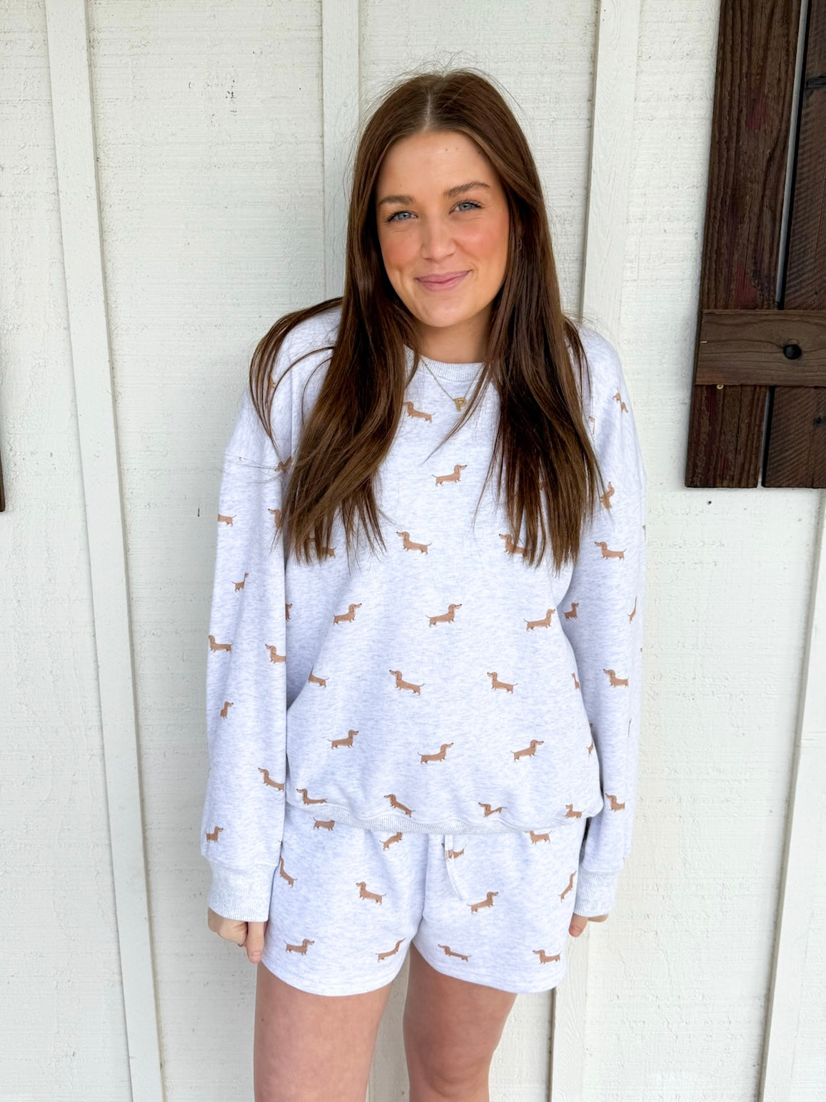 Cuddle up in canine comfort with this adorable matching lounge set featuring playful dog prints throughout. The cozy long-sleeve sweatshirt pairs perfectly with high-waist sweatshorts for a coordinated look that's equal parts cute and comfy. Whether you're lounging at home or running errands, this set keeps you looking effortlessly put-together while feeling like you're wrapped in a warm hug. Perfect for dog lovers who refuse to compromise on style or comfort.