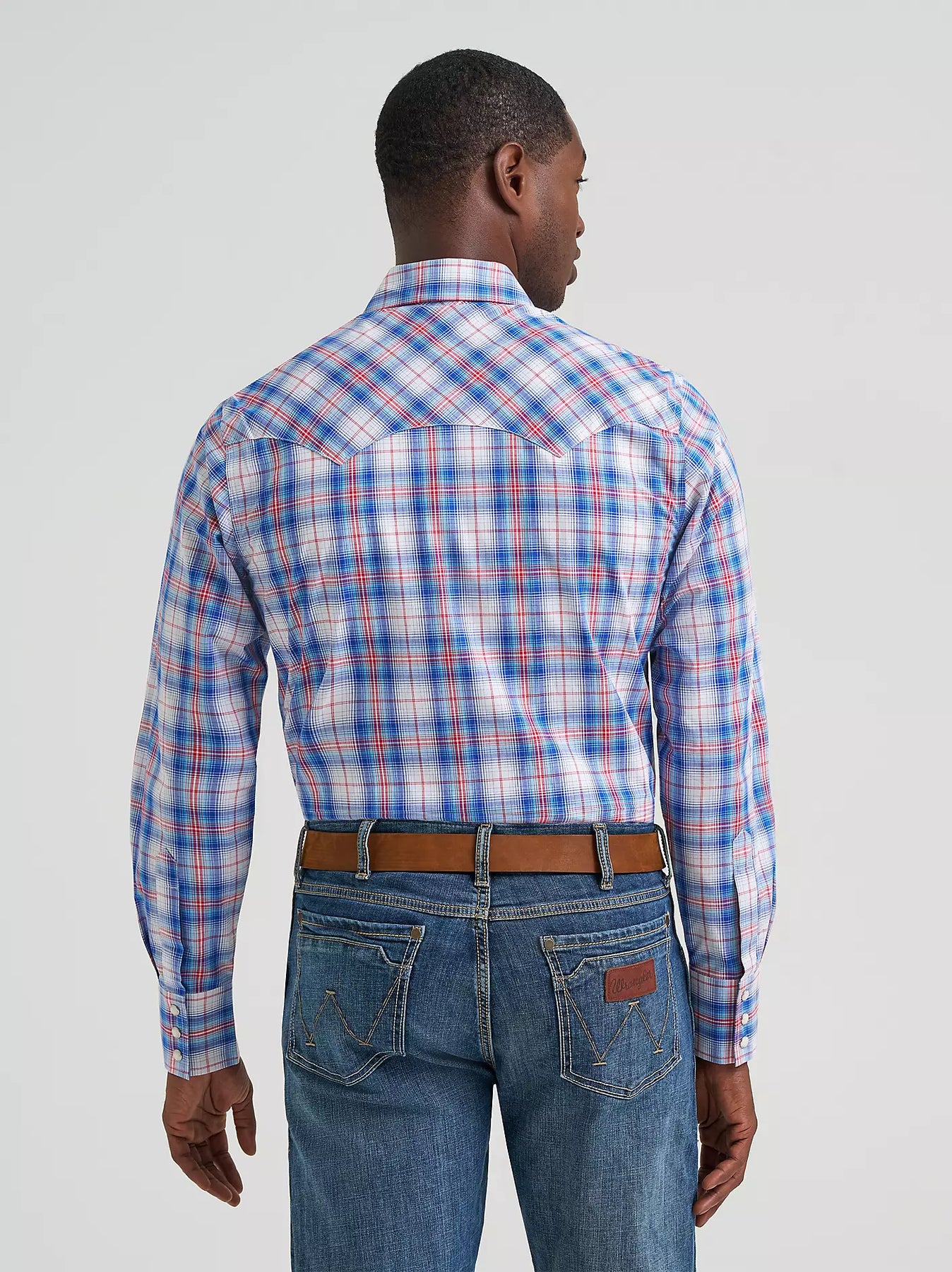 Paying tribute to our Western roots, the men's Wrangler Retro® long-sleeve sawtooth snap pocket western shirt gives the classic style you know a modern look and feel. It comes with all the same details you love, including a spread collar, pointed yokes, and two sawtooth snap flap pockets with embroidery to add a bold element to every outfit. Plus, it features a modern fit and it's crafted from cotton for comfort and long-lasting durability, no matter how often you wear it. Wear it with a pair of Wrangler Retro bootcut jeans to complete the look for any occasion.