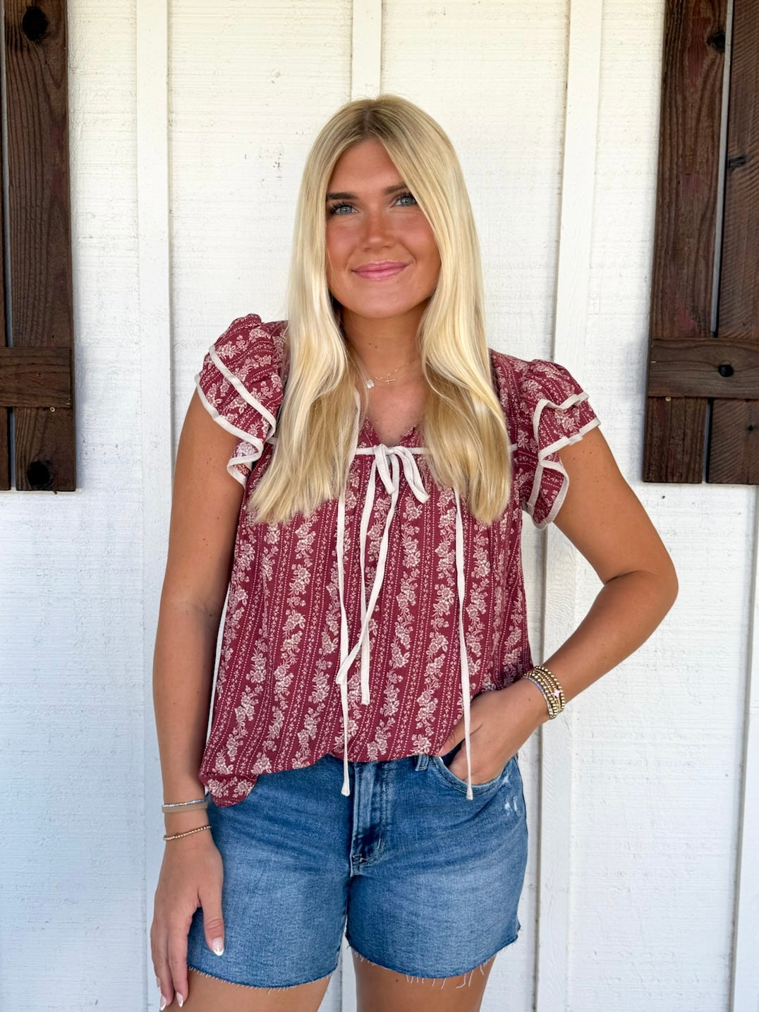 The Porte Top brings a playful twist to your wardrobe with its V-neck and short ruffle layered sleeves. Featuring a double front tie and delicate ruffle trim, this relaxed-fit top is crafted from lightweight woven fabric that keeps you cool and comfortable. The charming stripe floral pattern adds a fresh, flirty vibe perfect for sunny days and casual outings.