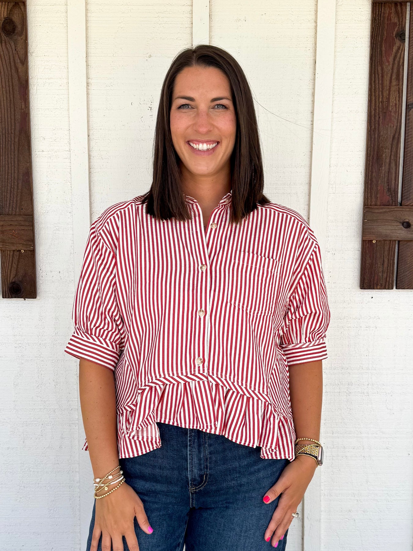 The Anniston Top brings a playful twist to your wardrobe with its stripe pattern cuff band and charming ¾ sleeves. Featuring a ruffle hem and button-front closure, this lightweight woven top offers a breezy, non-sheer feel perfect for sunny days. Unlined for easy comfort, it’s a fun and flirty choice to brighten any outfit.