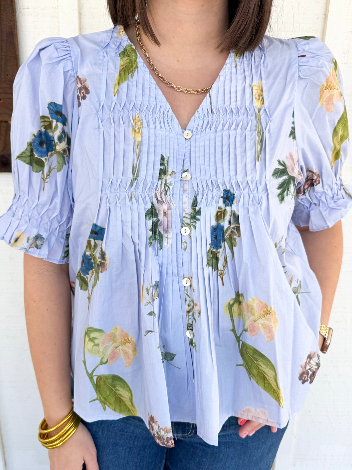 Bloom into spring with The Monica Top, a charming floral printed tee that brings effortless style to your everyday rotation. Featuring delicate puff sleeves that add a touch of whimsy, a flattering V-neckline, and a slightly cropped silhouette, this short sleeve beauty is perfect for pairing with your favorite high-waisted bottoms. Light, breezy, and undeniably cute—your new go-to for those days when you want to feel fresh and fabulous.