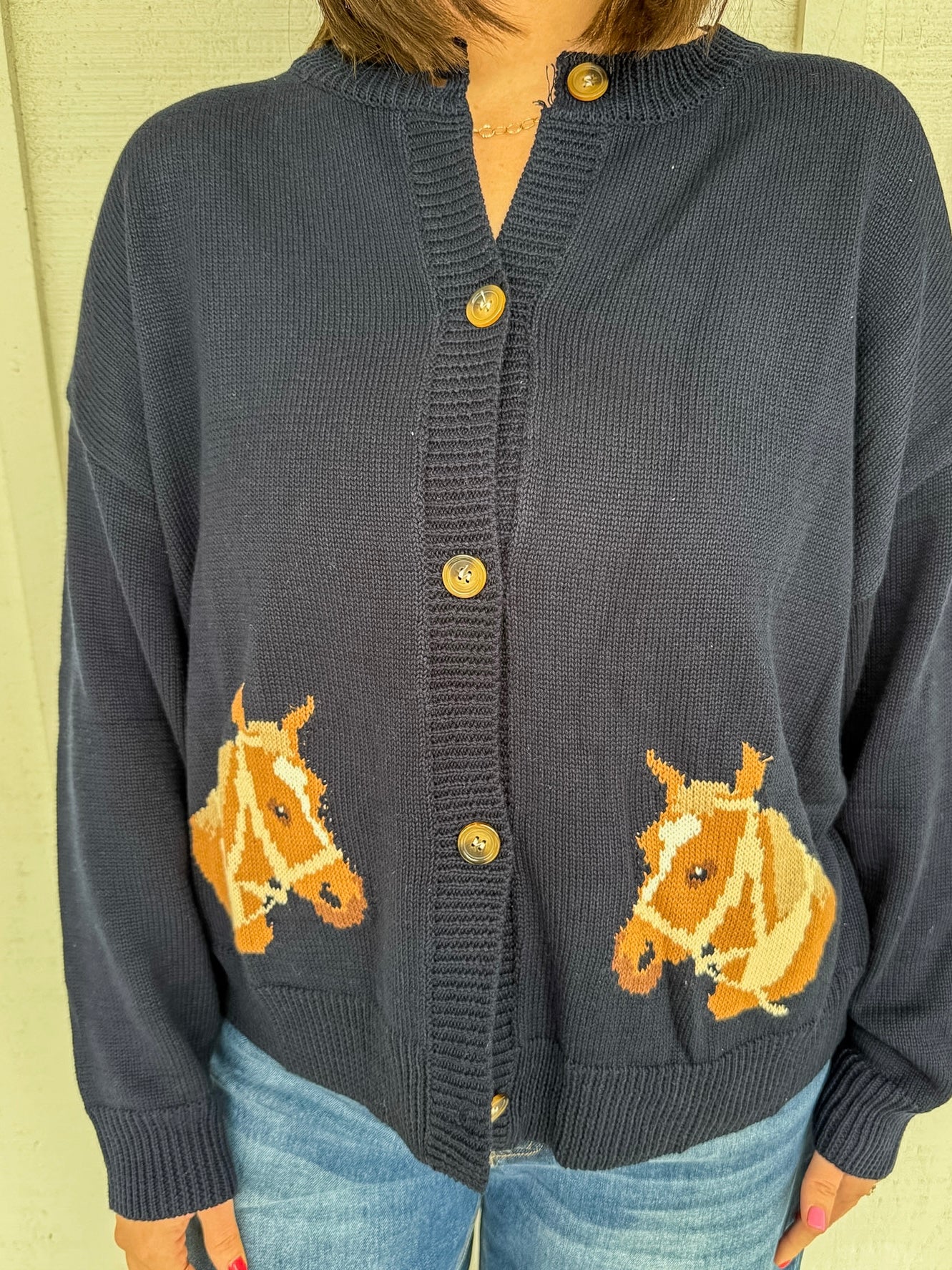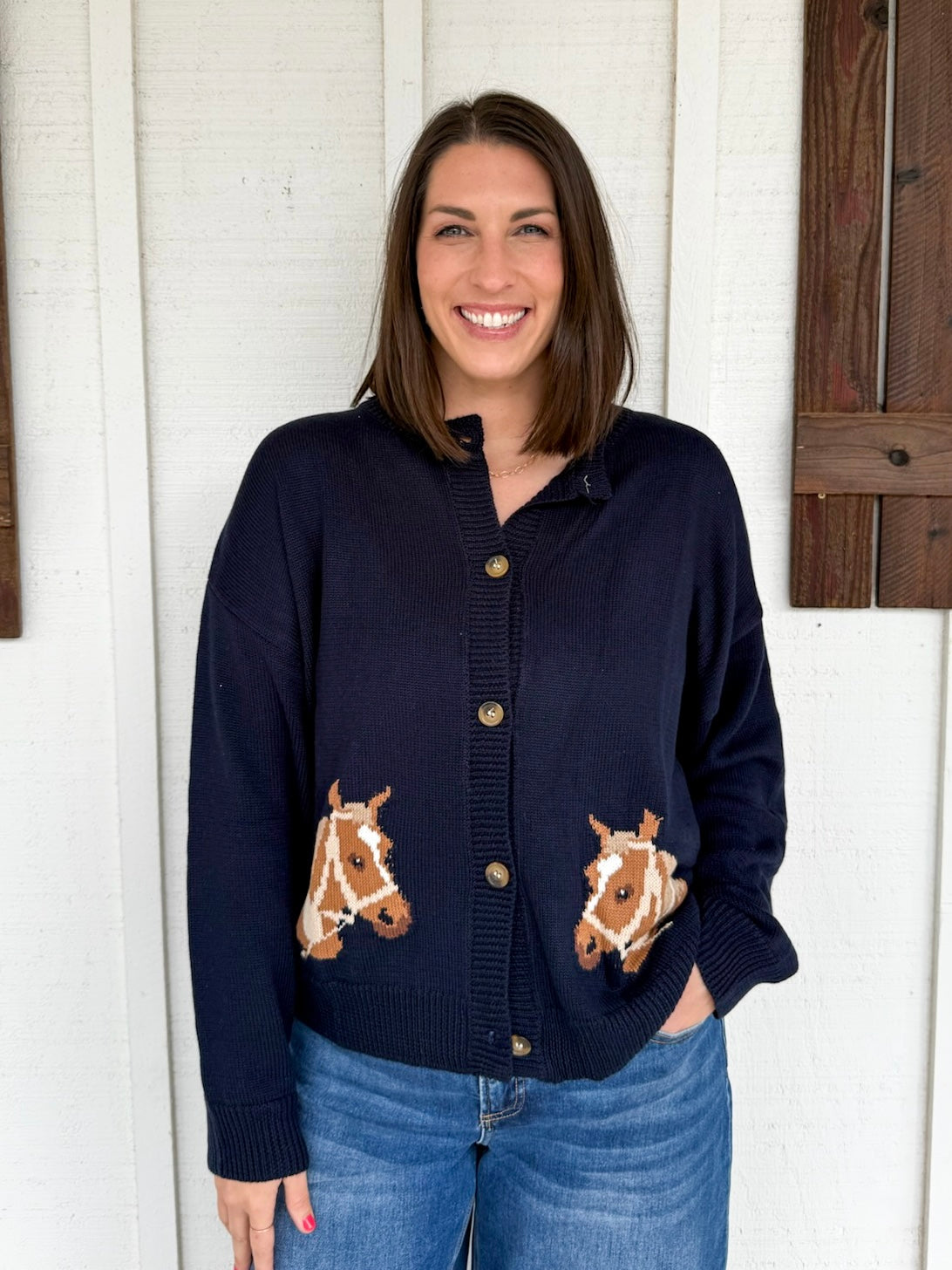 The Wylder Cardigan is your new go-to layering piece with its charming horse graphic and cozy long sleeves. This round neck cardigan brings a playful, Western-inspired vibe perfect for casual days or dressing up your favorite tee. Soft and comfortable, it's ideal for layering through the seasons while adding a touch of personality to any outfit.
