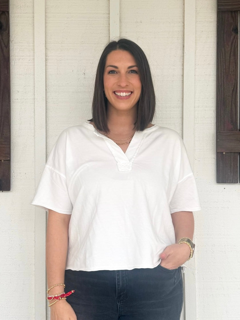 The Lennia Top is your new go-to for effortless style. This washed knit top features a charming split neckline and raw edge detailing that adds just the right amount of edge to your everyday look. The relaxed short sleeves keep things breezy and comfortable, making it perfect for layering or wearing solo. Soft, touchable fabric that feels as good as it looks—throw it on with your favorite jeans and you're ready to go.