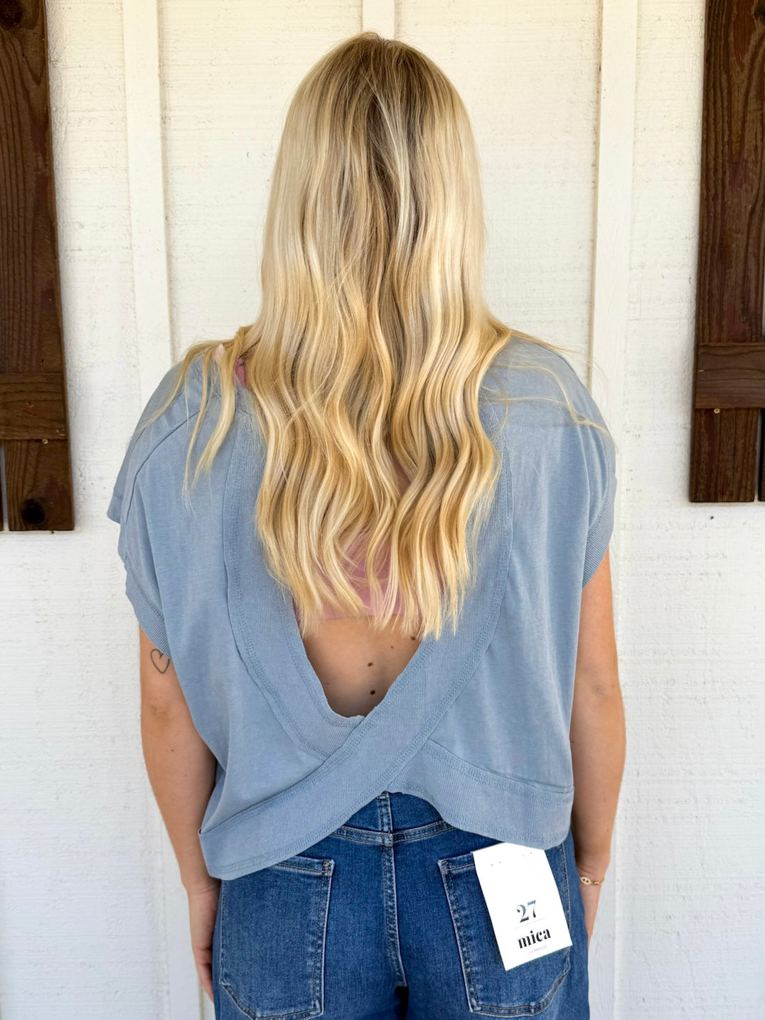 Meet your new summer staple—The Kyra Top. This boxy crew neck tee features relaxed sleeves and an unexpected opening in the back that adds just the right amount of edge to your everyday look. Throw it on with distressed denim shorts for that effortlessly cool, laid-back vibe that says you woke up like this (even if you didn't). Perfect for hot days when you want comfort without sacrificing style.